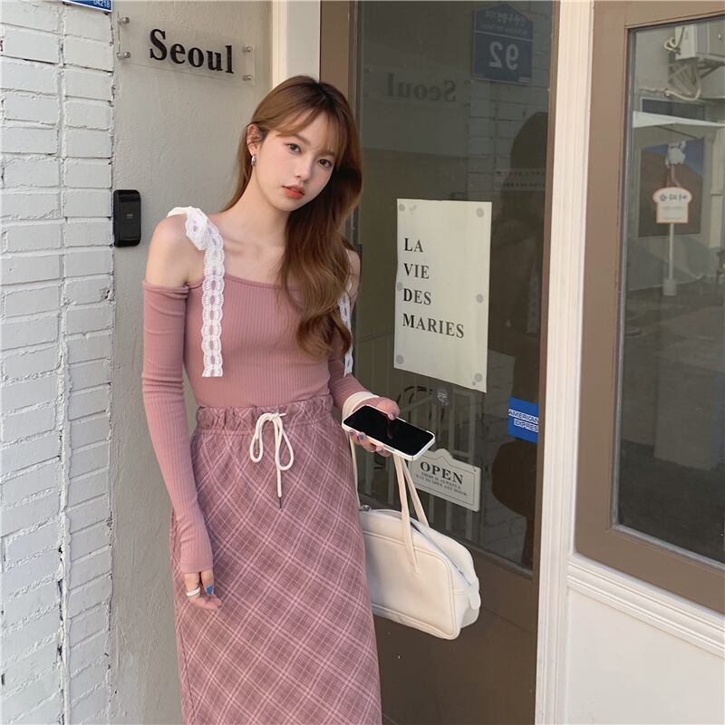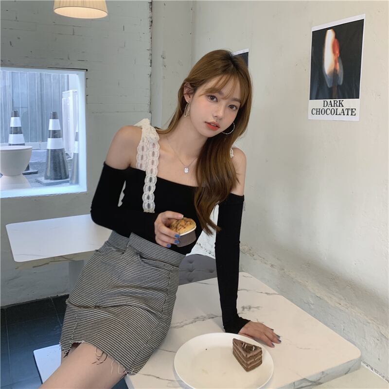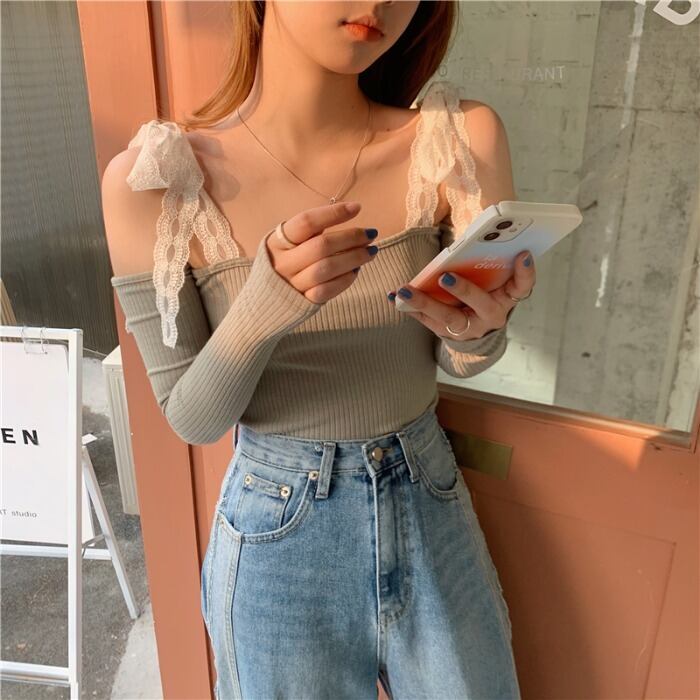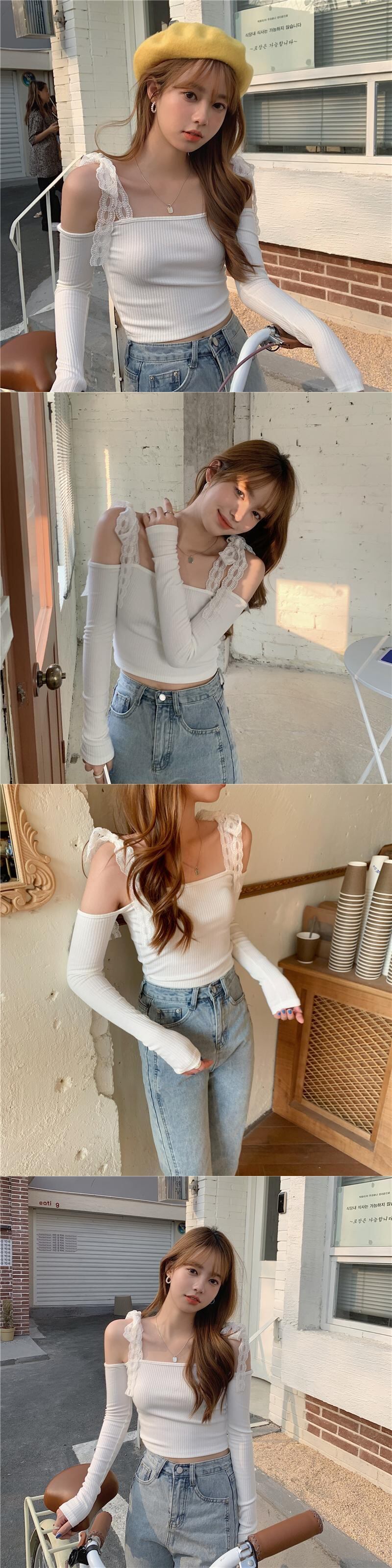 ショートレースシャツ トップス レディーススプリングスリムストラップレスTシャツ ロング 春物 ステッチ kumikum18395257003