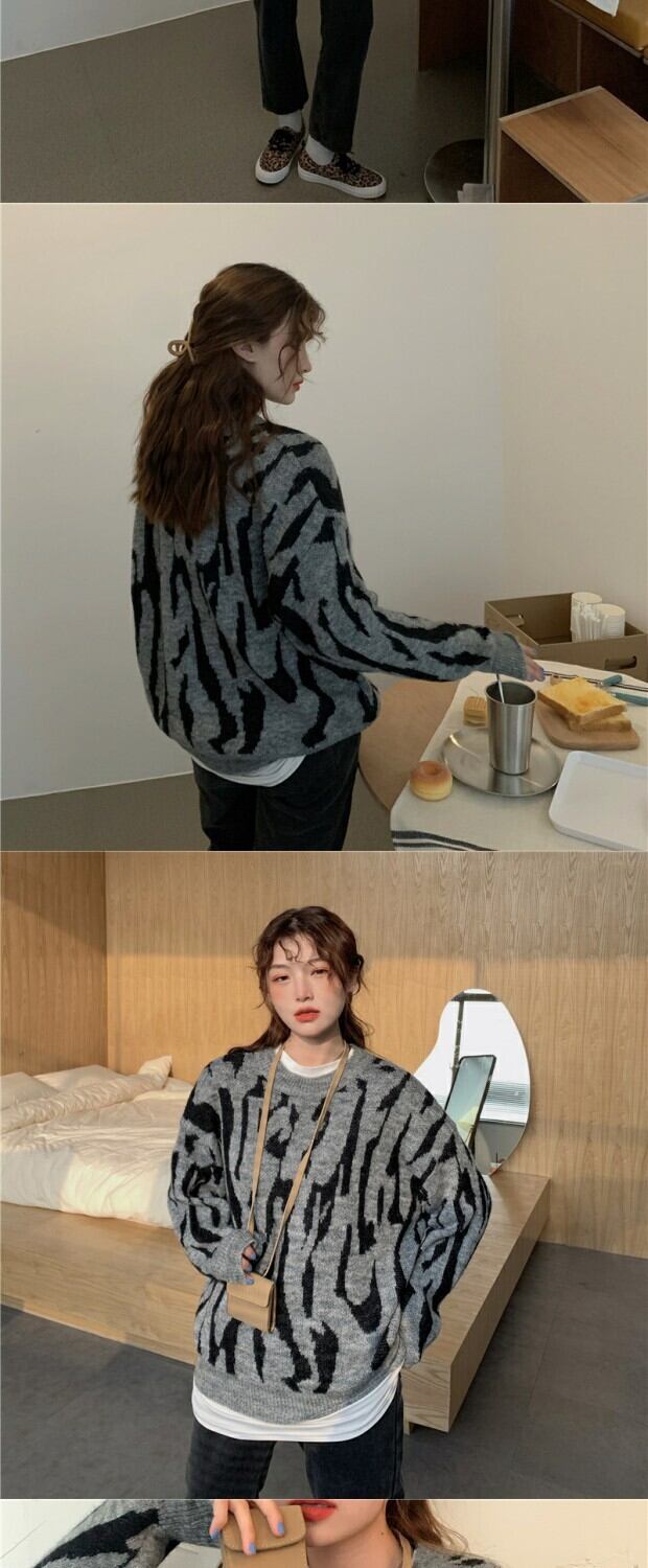 スタンダードカラーパターンラウンドネックセーター ブラウス レディースオータムルーズプルオーバー ロング レトロ 秋物 Oネック kumikum92215999441