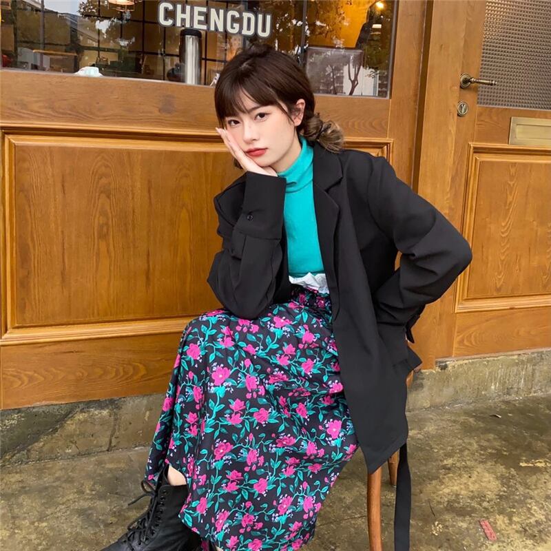 色:ティールボトミングシャツ,ヴィンテージフラワースカート,黒のネクタイコート
