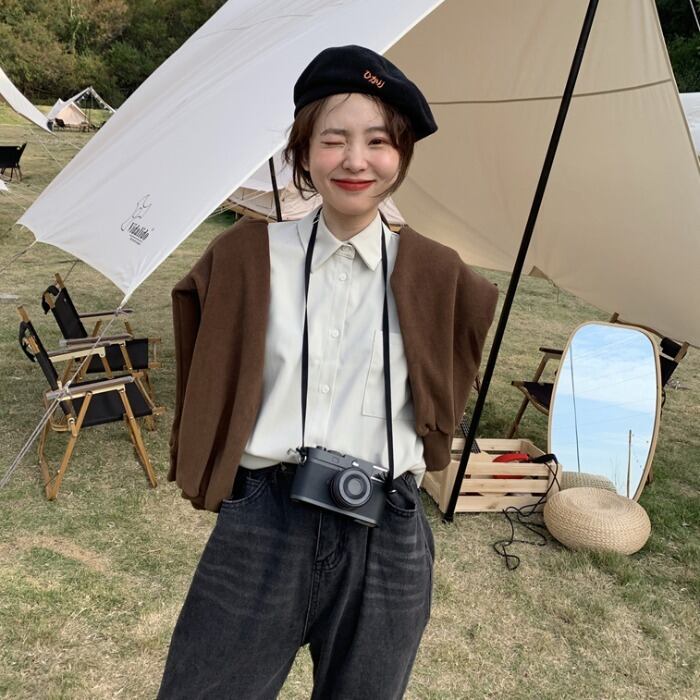 色:コーヒー色のセーター,オフホワイトのシャツ