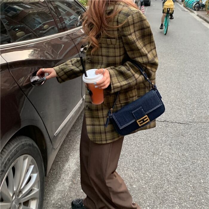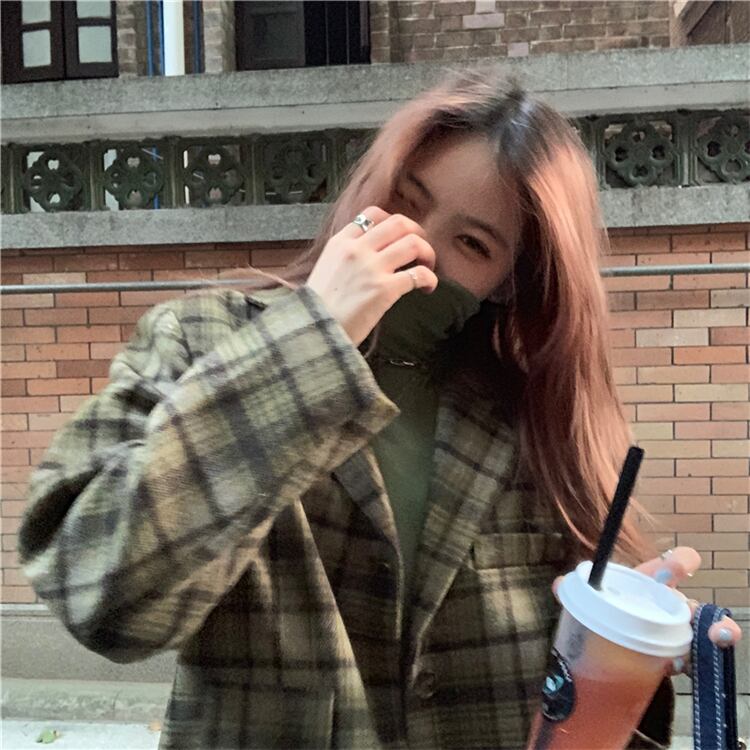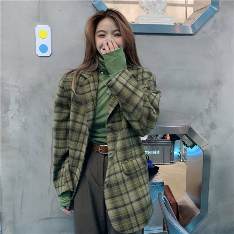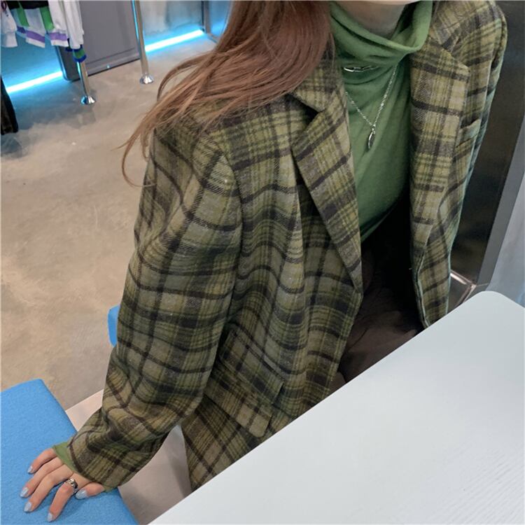 グリーン格子柄スタンダードジャケット レディースウィンタールーズカジュアル レトロ 冬物 kumikum57817816145