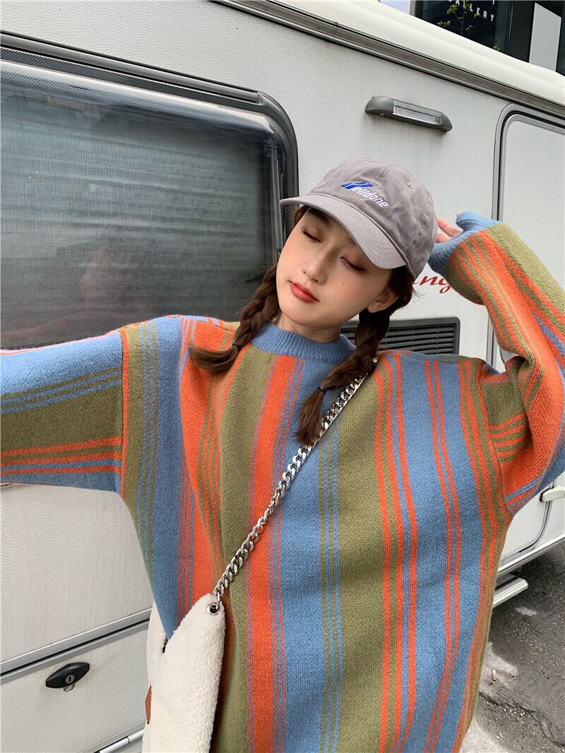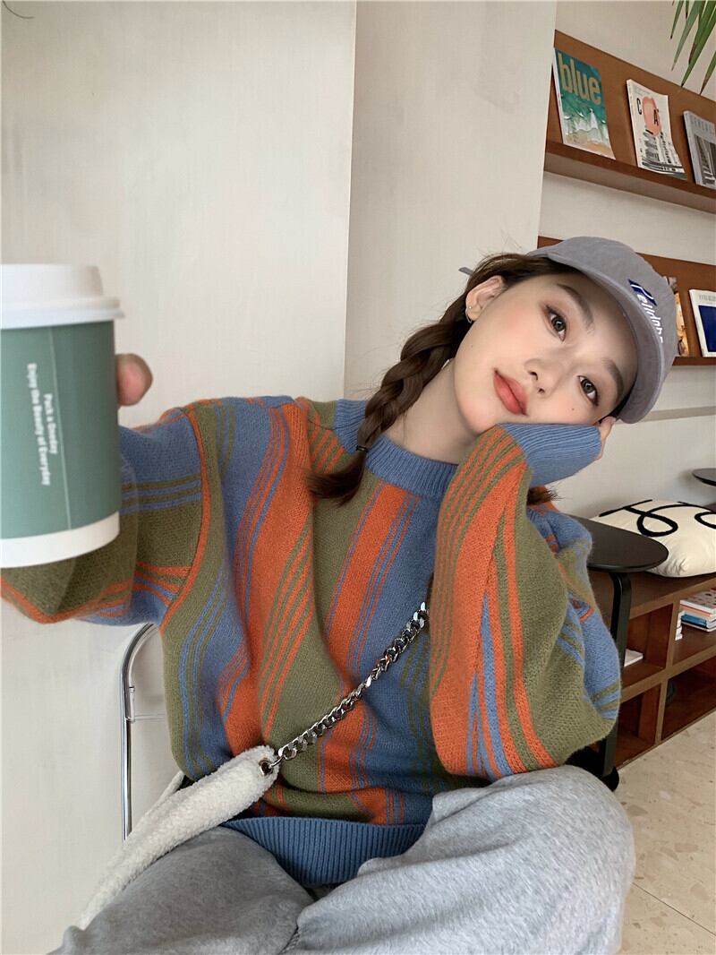 スタンダードカラーストライプルーズプルオーバー セーター レディーススタイルトップス オータムウィンター ロング レトロ 秋物 冬物 kumikum22744020419