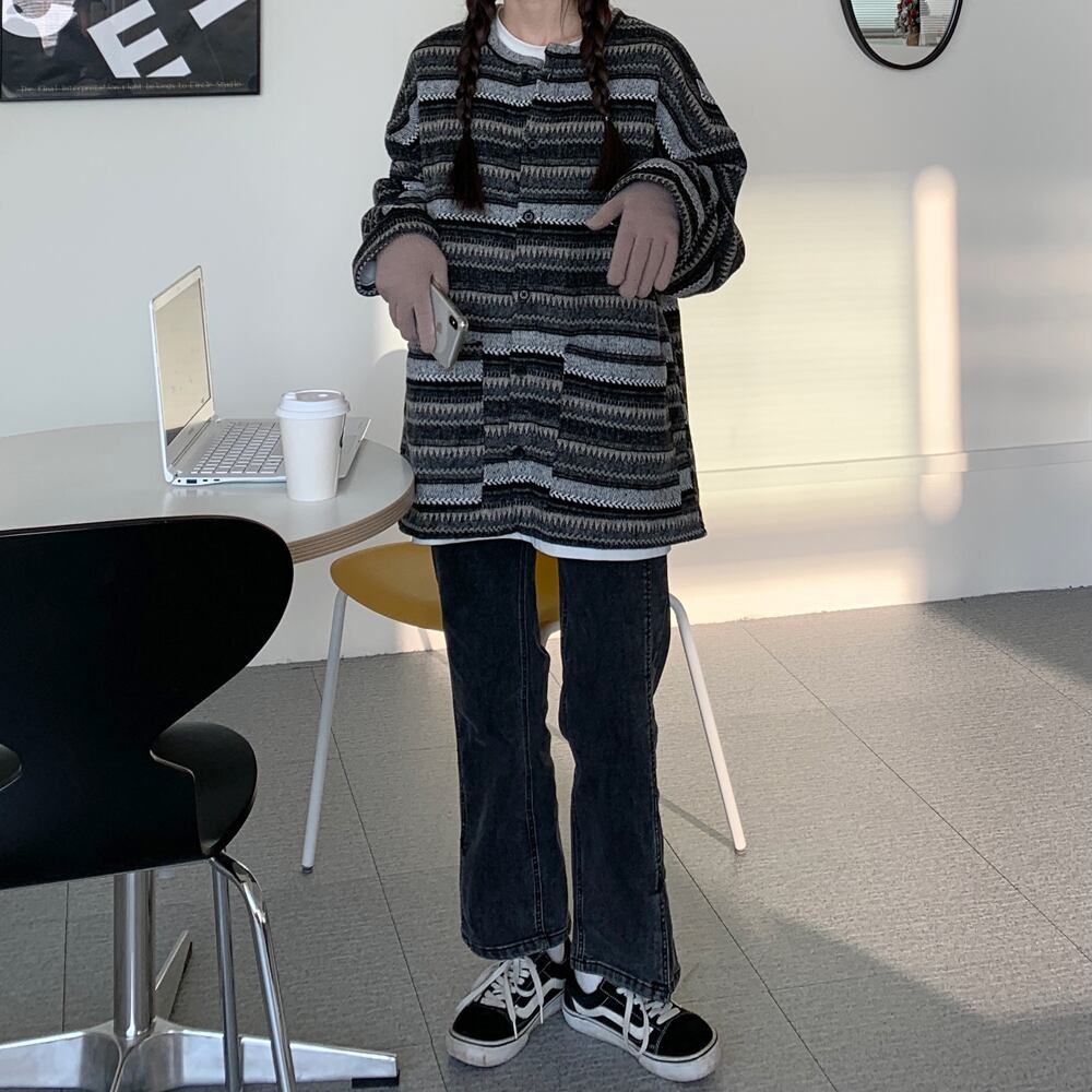 スタンダードカラーストライプセーター カーディガンジャケット ウィンタールーズトップス ロング レトロ 冬物 kumikum3420274464