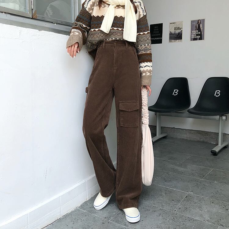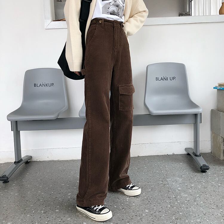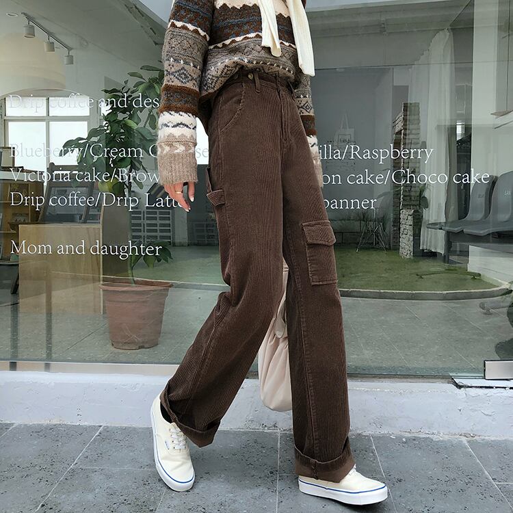 コーデュロイパンツ スプリングジーンズ ルーズハイウェストウェストオーバーオール ワイドレッグ 春物 ワイドパンツ kumikum19535680484