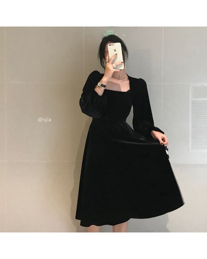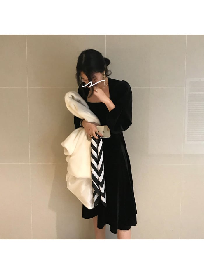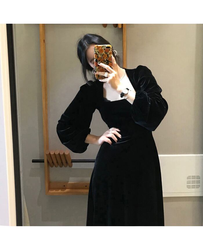ベルベットドレス スカート スプリングウェスト長袖スリーブAライン ロング 春物 kumikum37584355682
