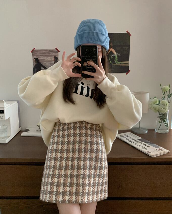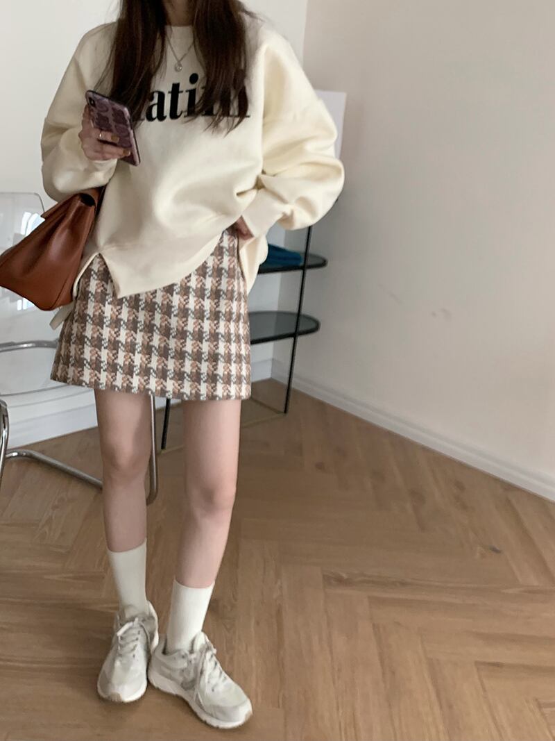 ルーズラウンドネックセーター スプリングハイウェストウェスト格子柄Aラインスカート 春物 Oネック kumikum32706638127
