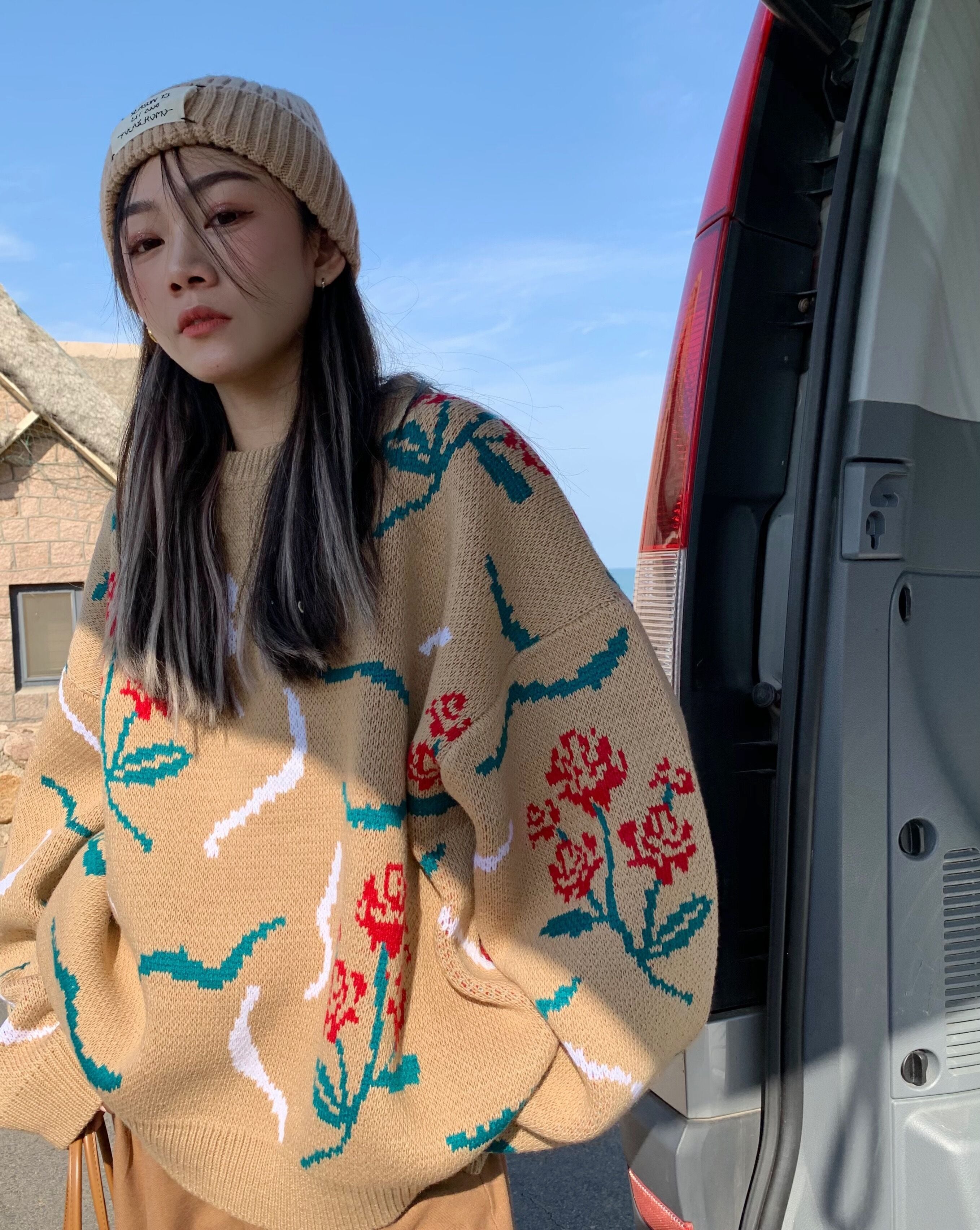 ヴィンテージラウンドネックスタイルニットセーター トップス レディースウィンタールーズプルオーバー ロング 冬物 Oネック ビンテージ kumikum45302759533