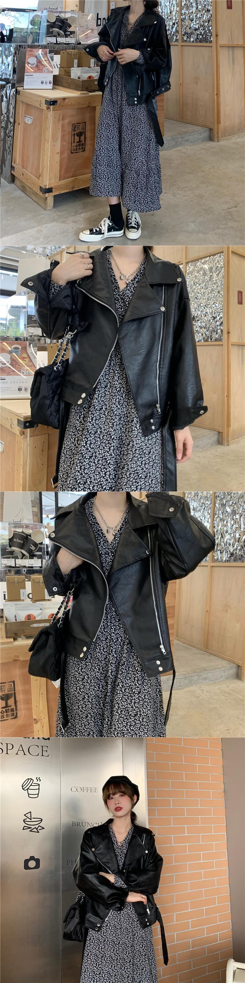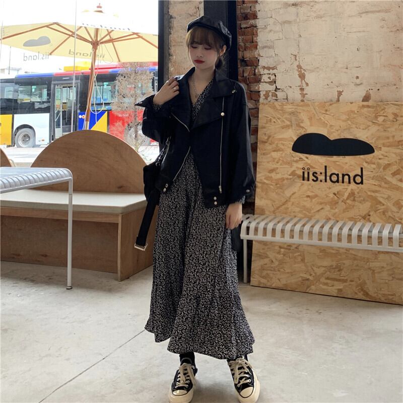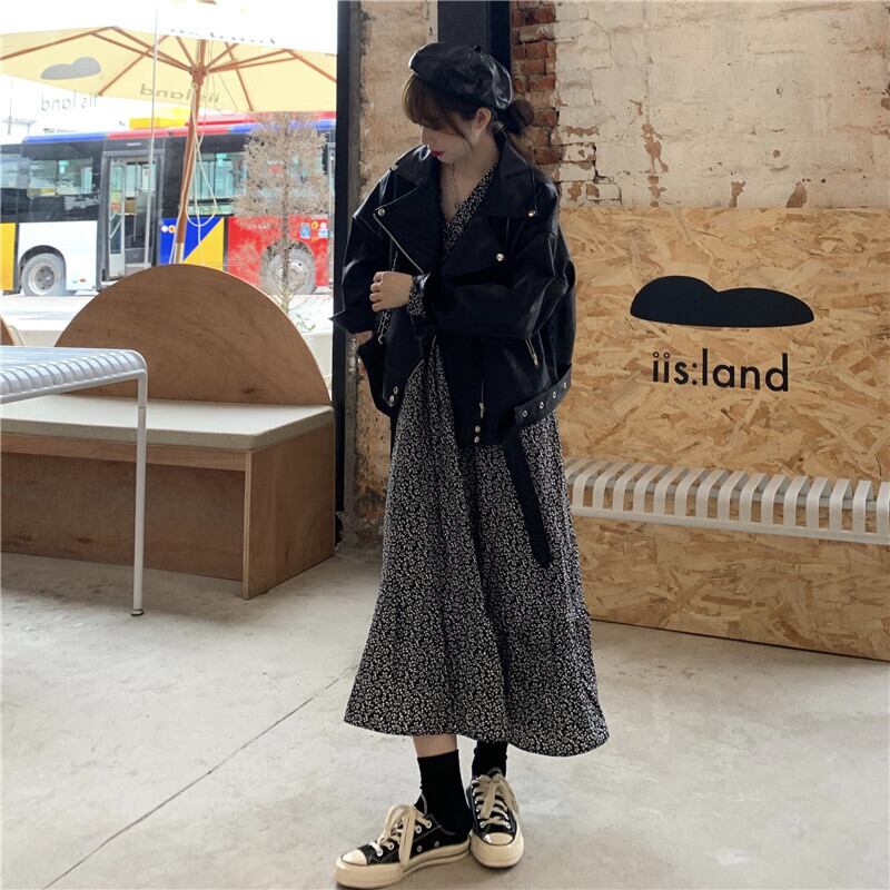 スタンダードVネックフローラルドレス オータムレザージャケット レトロ 秋物 花柄 kumikum86379786783