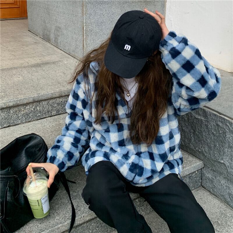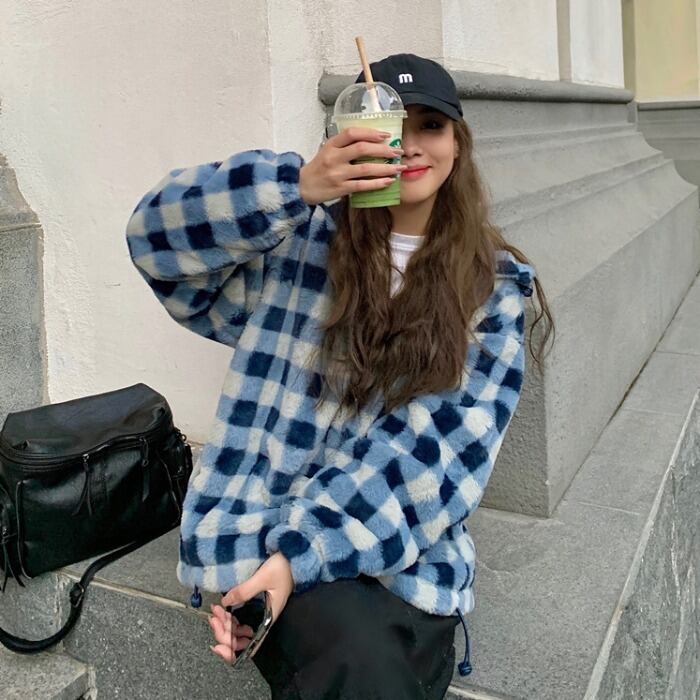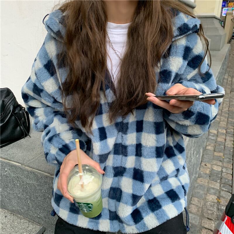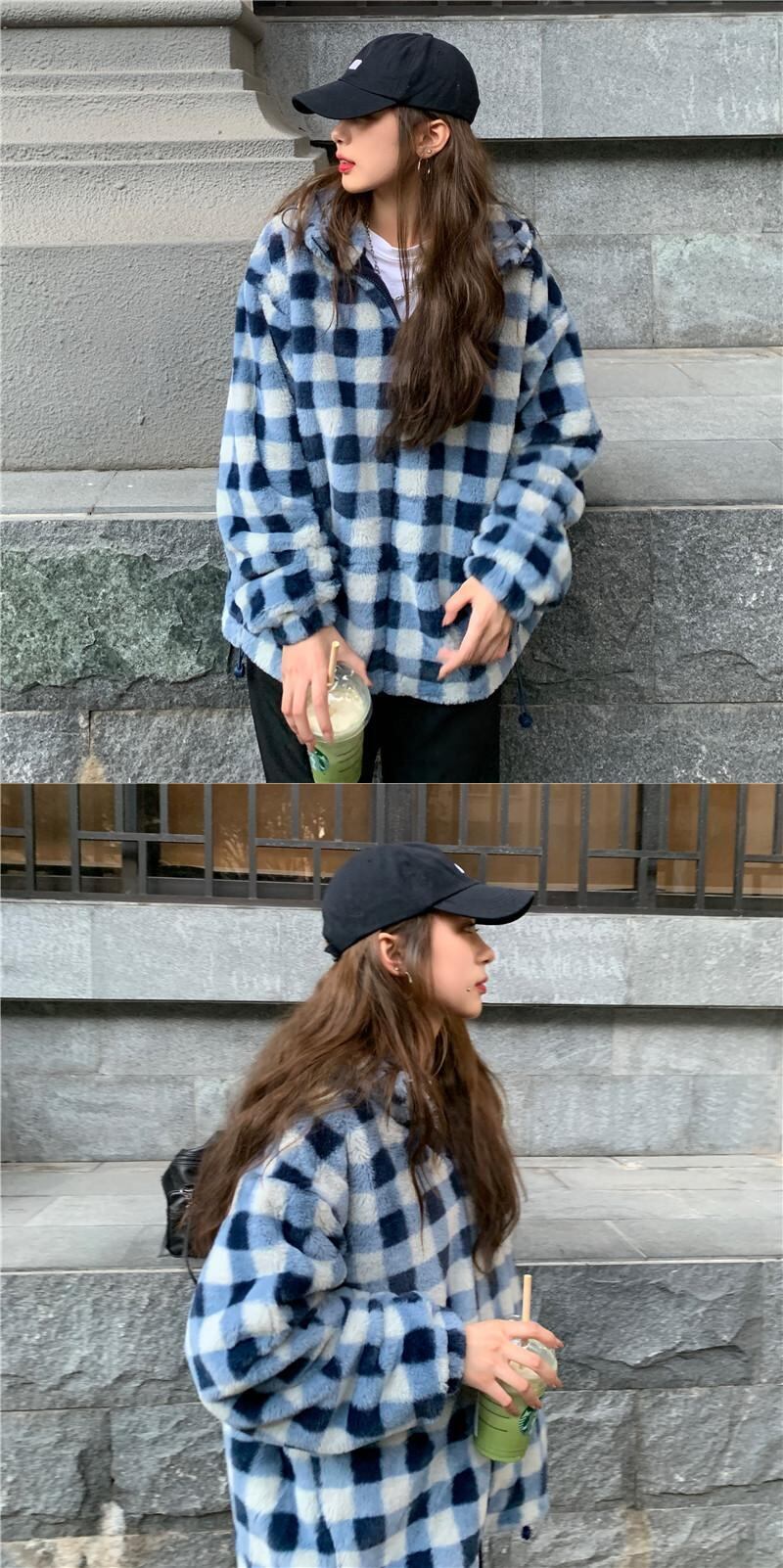 オータムウィンタールーズスタンダードブルー格子柄カーディガンジャケット レディースフード ロング レトロ 秋物 冬物 kumikum29738321923