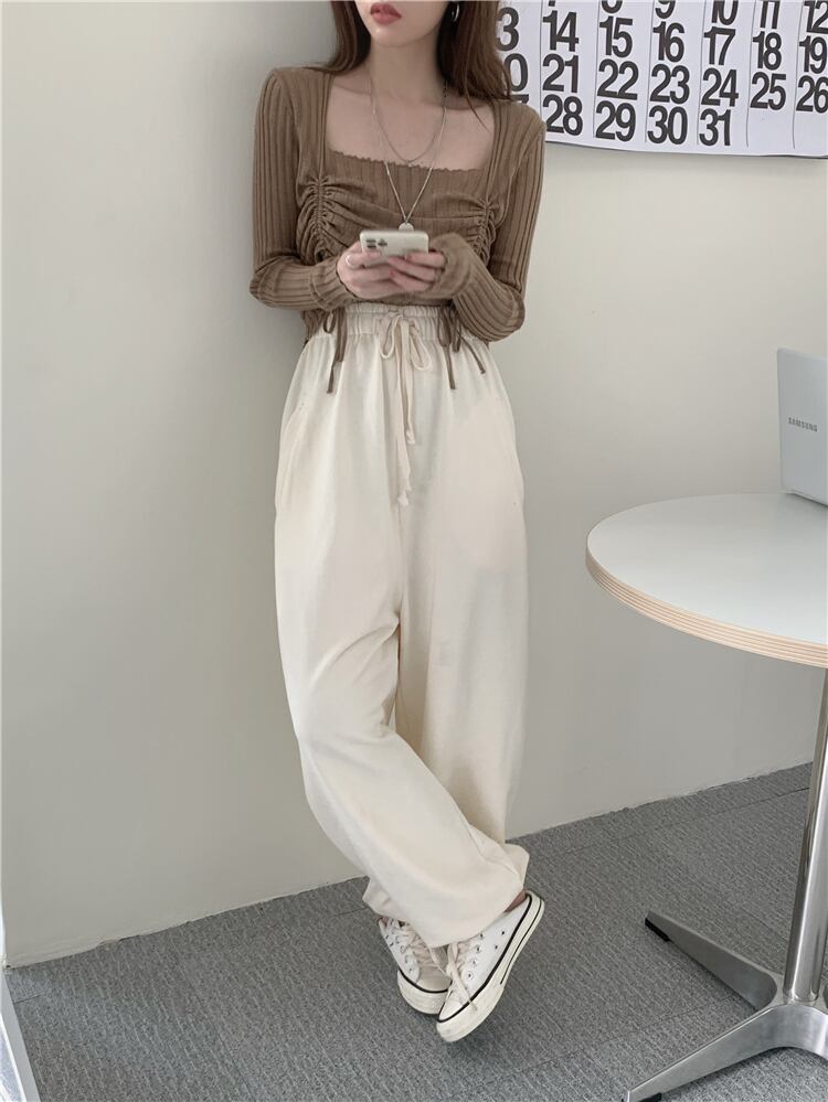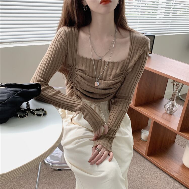 ショートギャザーニットセーター トップス レディースオータムスタイルスリム長袖スリーブ薄手シャツ ロング 秋物 スクウェア kumikum5625007000