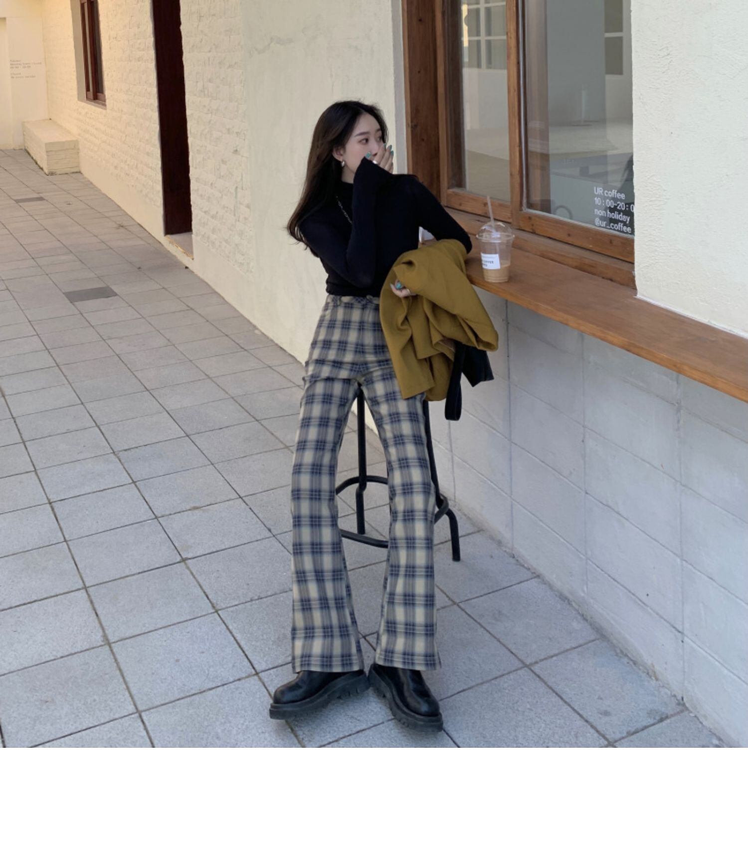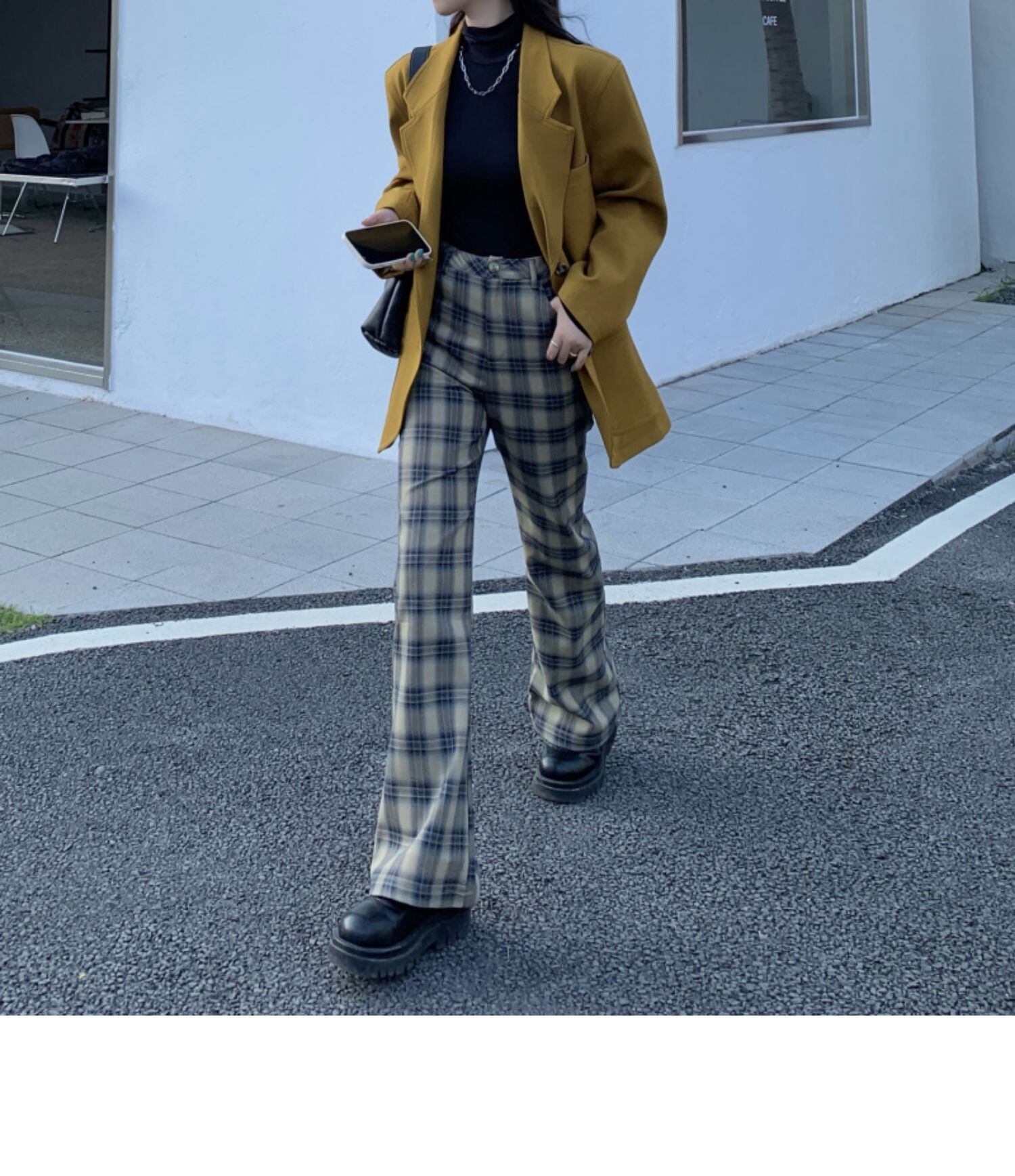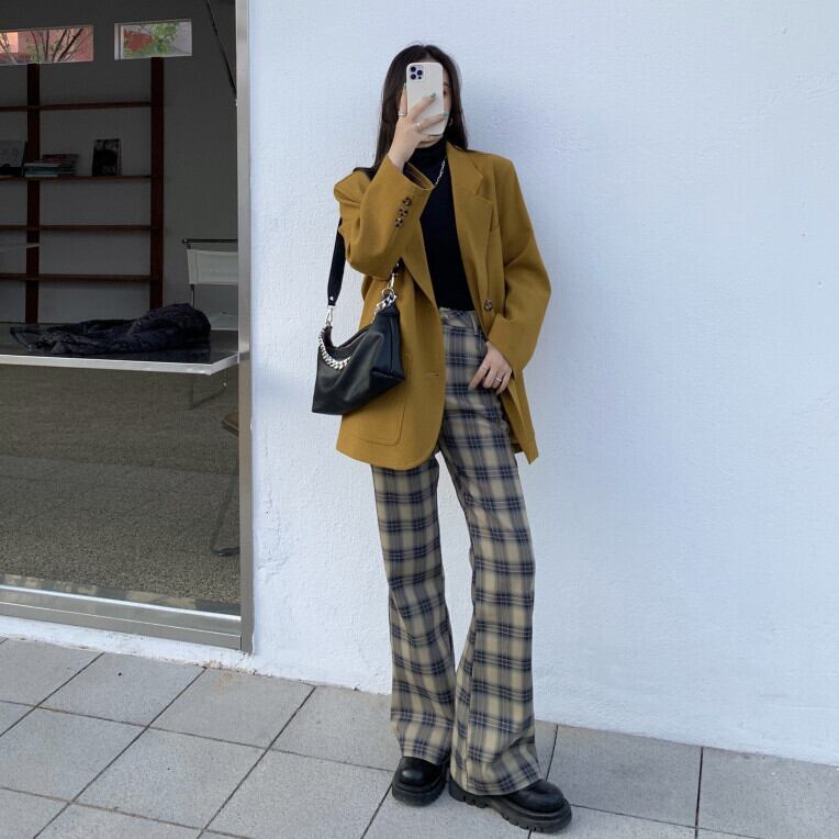 スタンダード格子柄ハイウェストパンツ ウィンタールーズカジュアル薄手 レトロ 冬物 kumikum19917202536