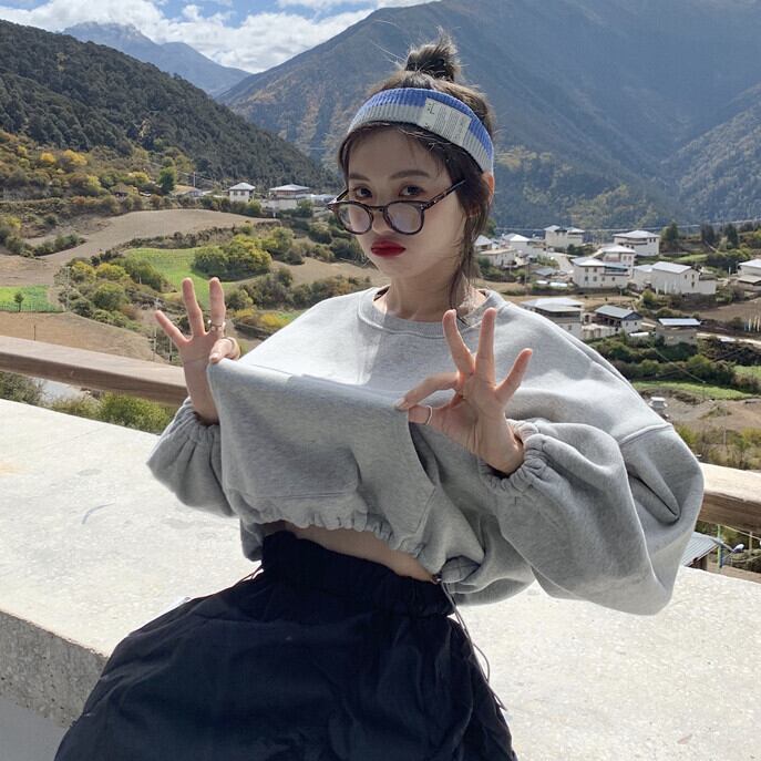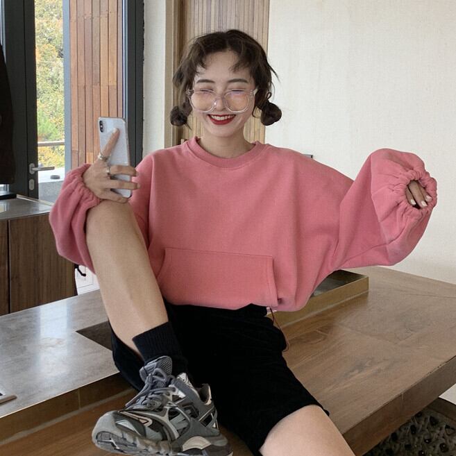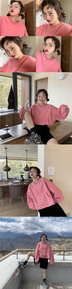 ギャザーショートラウンドネックプルオーバー セーター スプリングルーズシャツ ロング 春物 Oネック kumikum60568898171