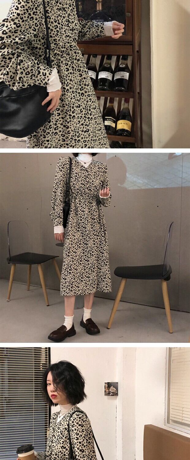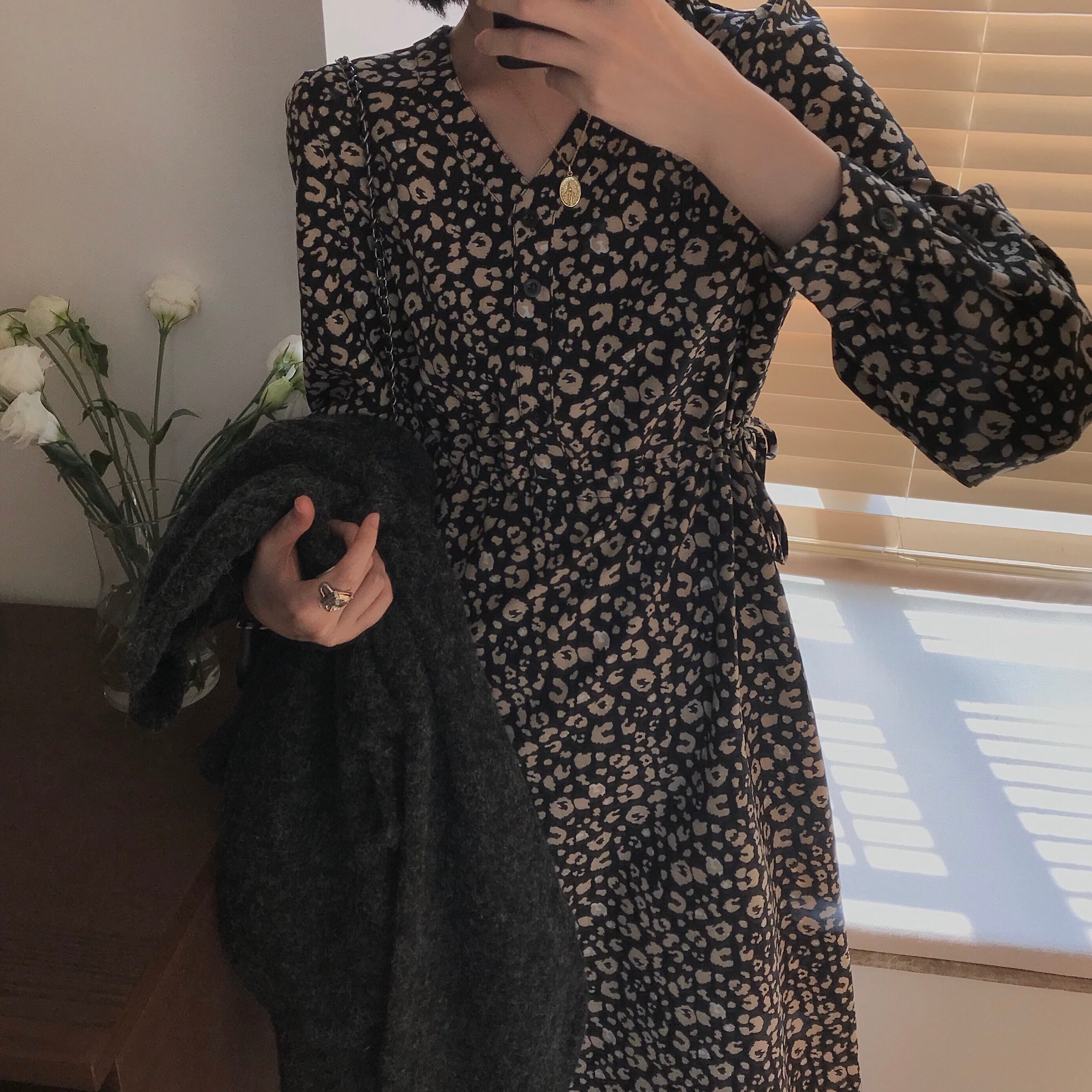 スタンダードVネックレオパードプリント柄ドレス ウィンタースタイルロングスカート 薄手 レトロ 冬物 kumikum77302322154