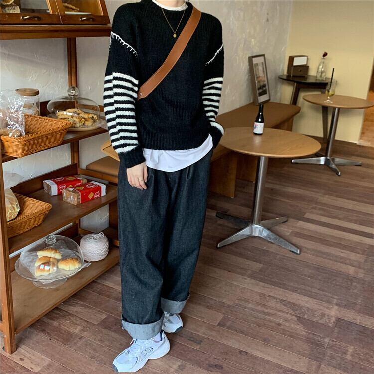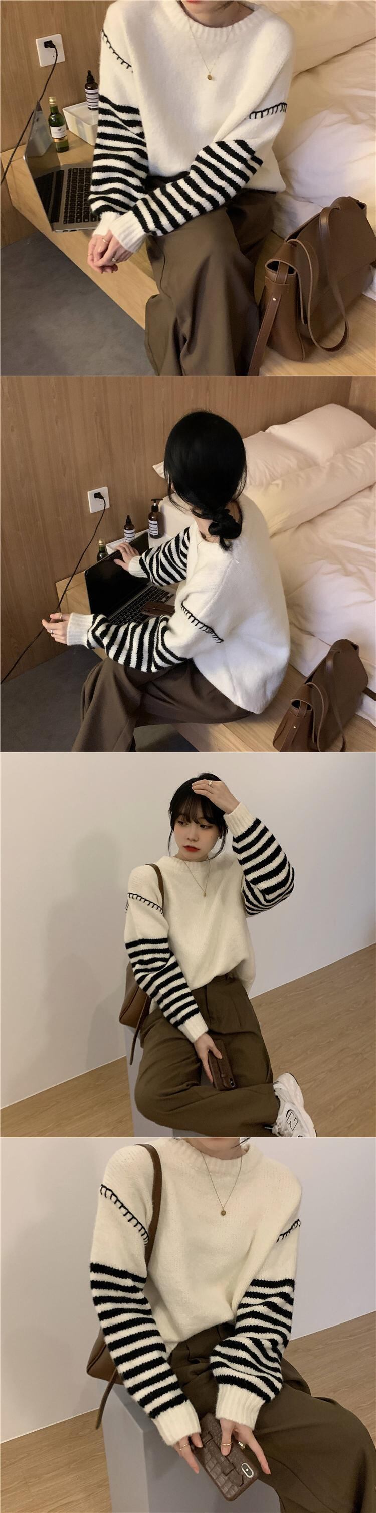 ストライプラウンドネックセーター トップス レディーススタイルルーズプルオーバー オータムウィンター ロング 秋物 冬物 Oネック kumikum93201018309