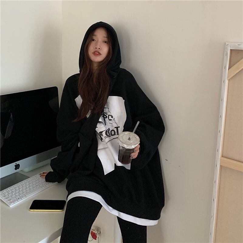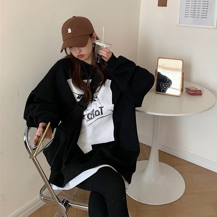 プリントフードベルベットセーター ジャケット スプリングルーズトップス ロング 春物 kumikum97960872397