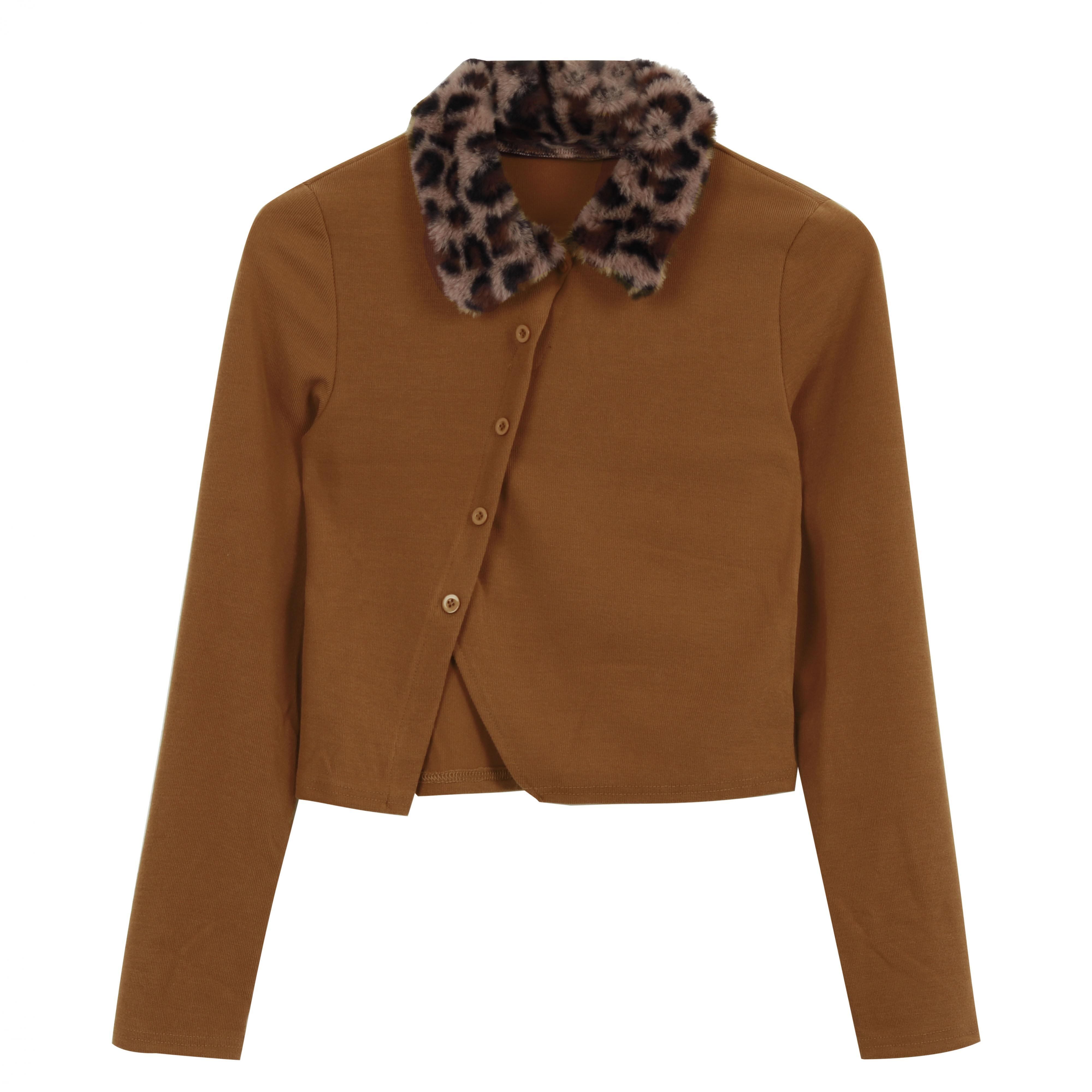 スタンダードカラーレオパードプリント柄シャツ スプリングカーディガンセーター ロングバックルショートニットトップス レトロ 長袖 春物 kumikum93573370812