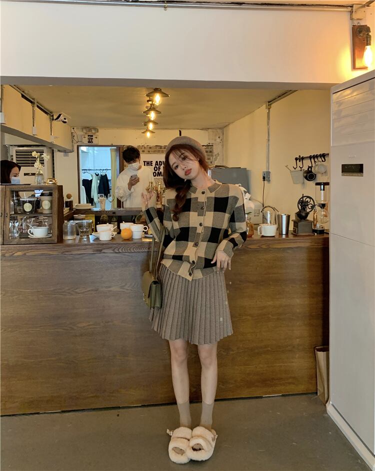 格子柄ルーズセーター カーディガンジャケット スプリングショートプリーツスカート ロング 春物 kumikum22816335475