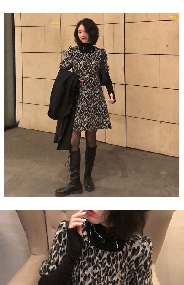 レッドスカート ウィンタースタンダードショートスリーブレオパードプリント柄ドレス レトロ 冬物 kumikum21440687310
