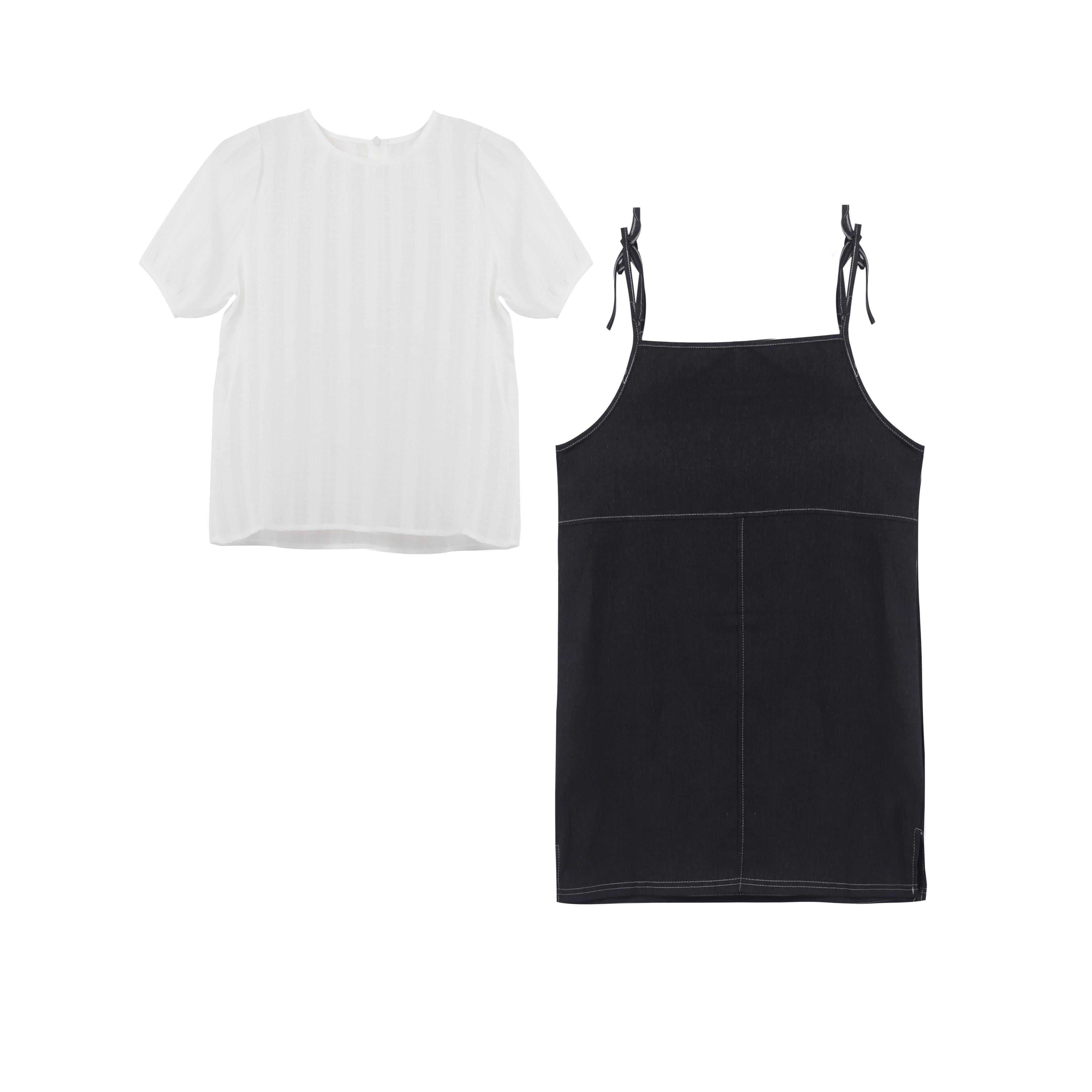 色:ブラックデニムスカート,ホワイトシフォントップ