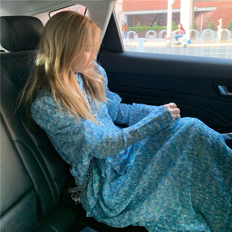 フローラルシフォンオータムウィンターウェスト長袖スリーブドレス ロング 秋物 冬物 ハーネス ベルト 花柄 スカート kumikum16969691393