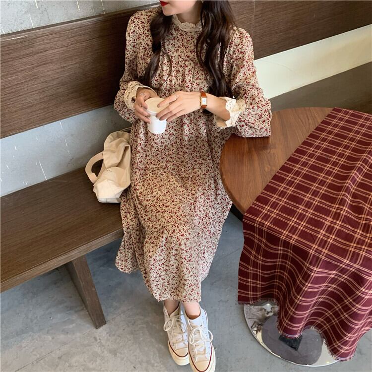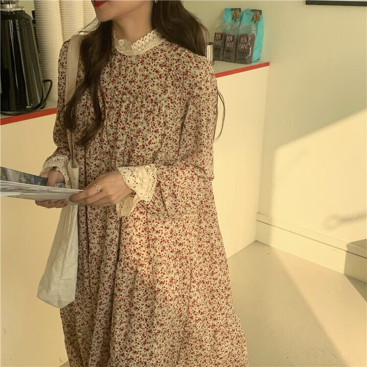 スタンダードフローラルレースカラードレス スカート スプリングロング薄手プリーツ レトロ 春物 花柄 ステッチ kumikum94348285518