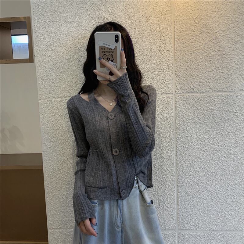 カーディガンVネックセーター スプリングスリムショートニットトップス ロング 春物 kumikum3395852678