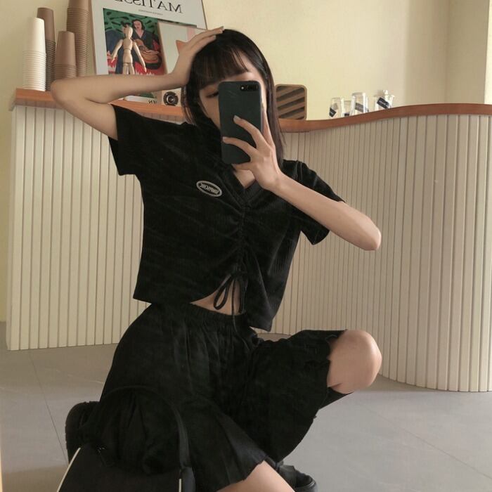 サマーブラックVネックギャザーショートルーズTシャツ 薄手スリムトップス 夏物 kumikum94226774731