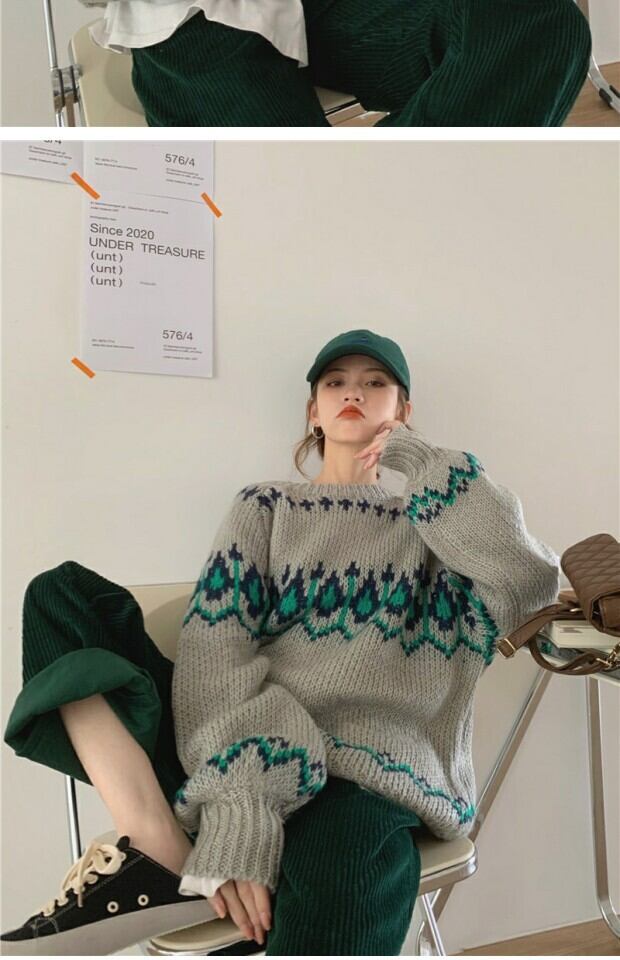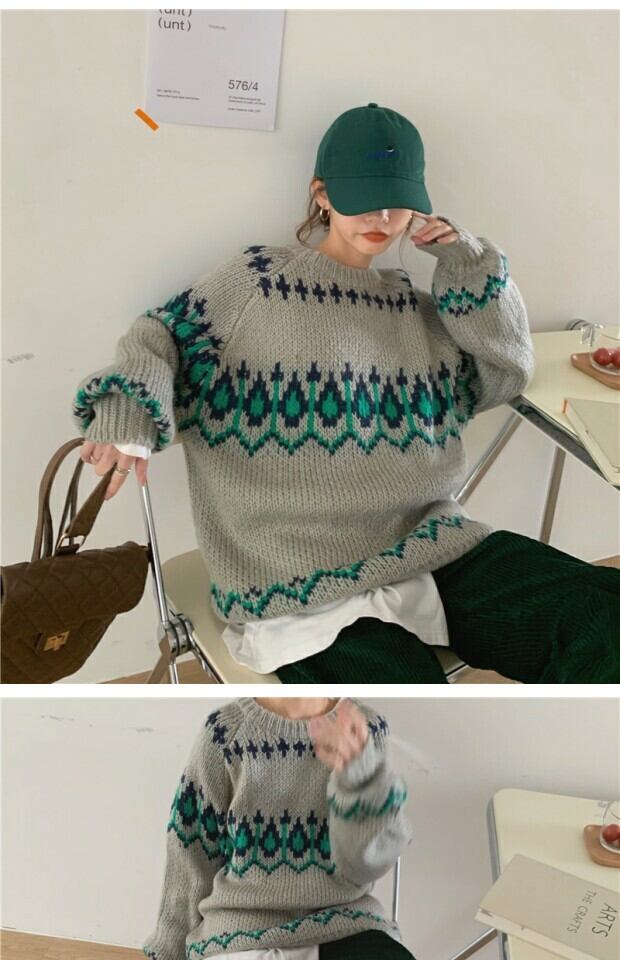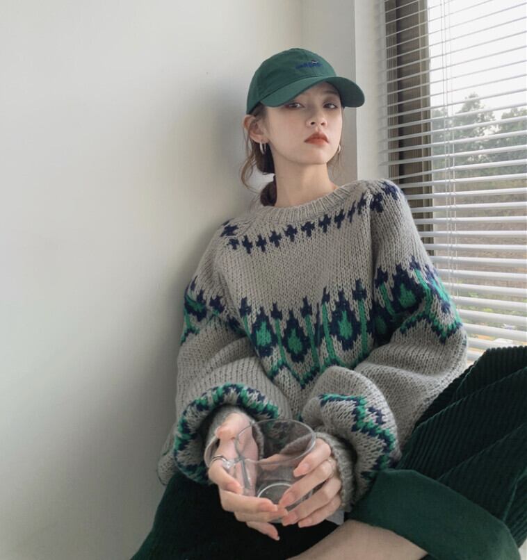 スタイルスタンダードルーズセーター レディースウィンターラウンドネックプルオーバー スリーブジャカードトップス ランタンスリーブ レトロ 冬物 Oネック kumikum71160018585