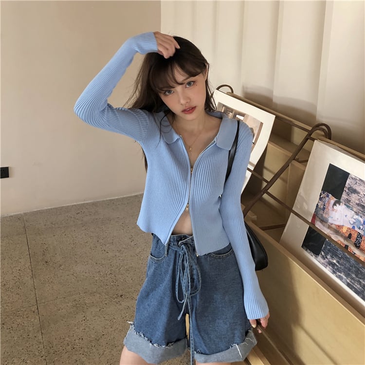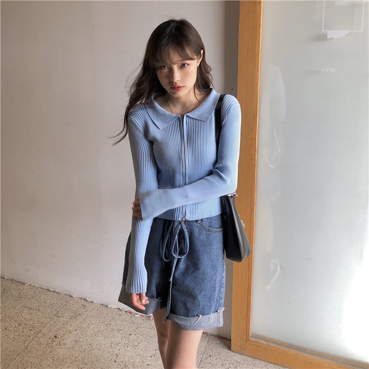 ダブルジッパースリムニットセーター トップス スタイルスプリングショートソリッド カラー ロング 春物 ソリッドカラー スクウェア kumikum15682227918