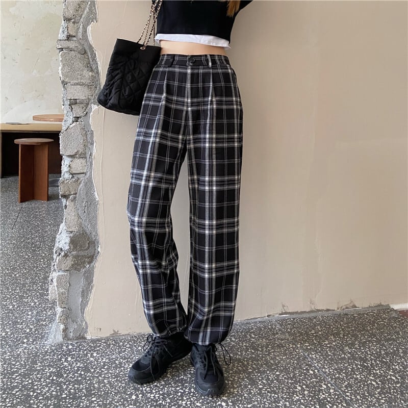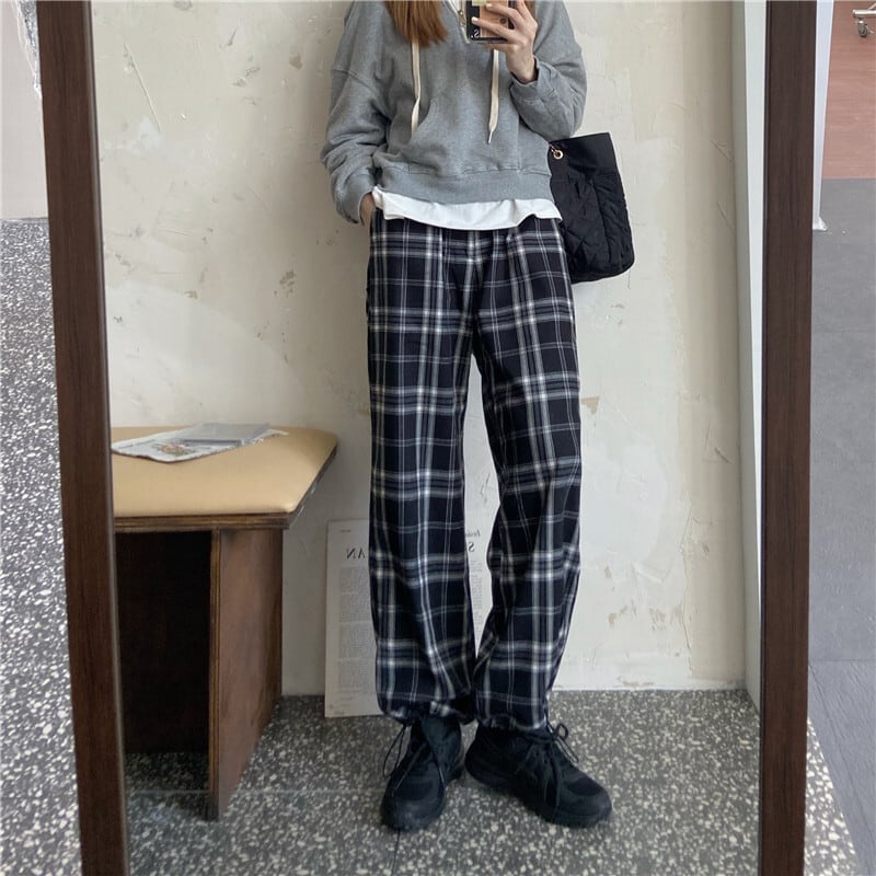 スタンダード格子柄ハイウェストウェストカジュアルパンツ オータムウィンタールーズ薄手 レトロ 秋物 冬物 kumikum10320925367