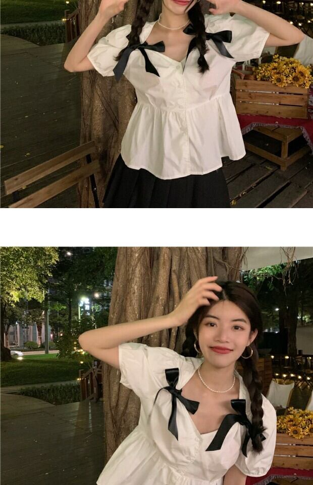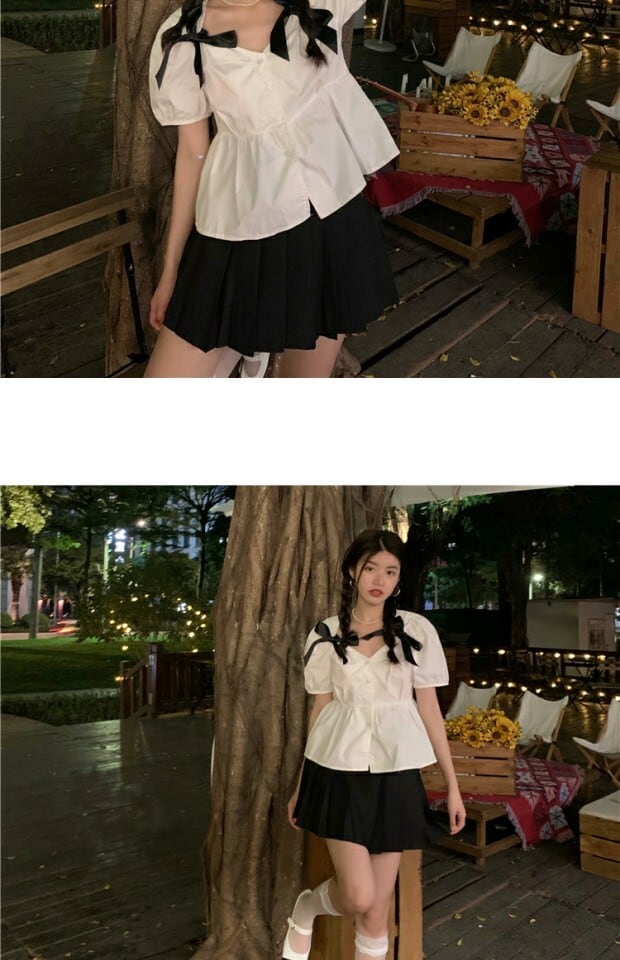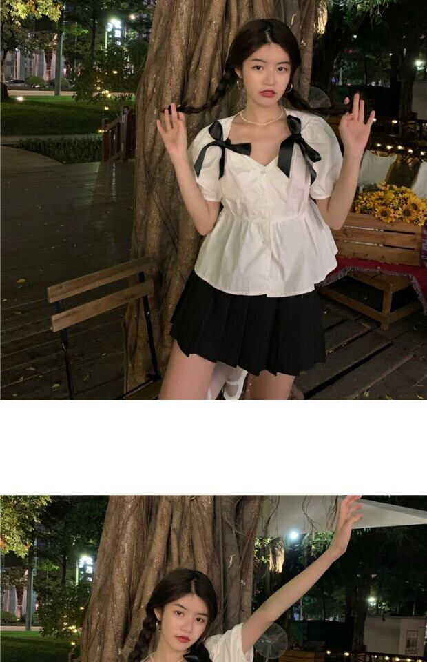 スリーブVネックホワイトシャツ サマーブラックスカート プリーツ 夏物 kumikum81079671713