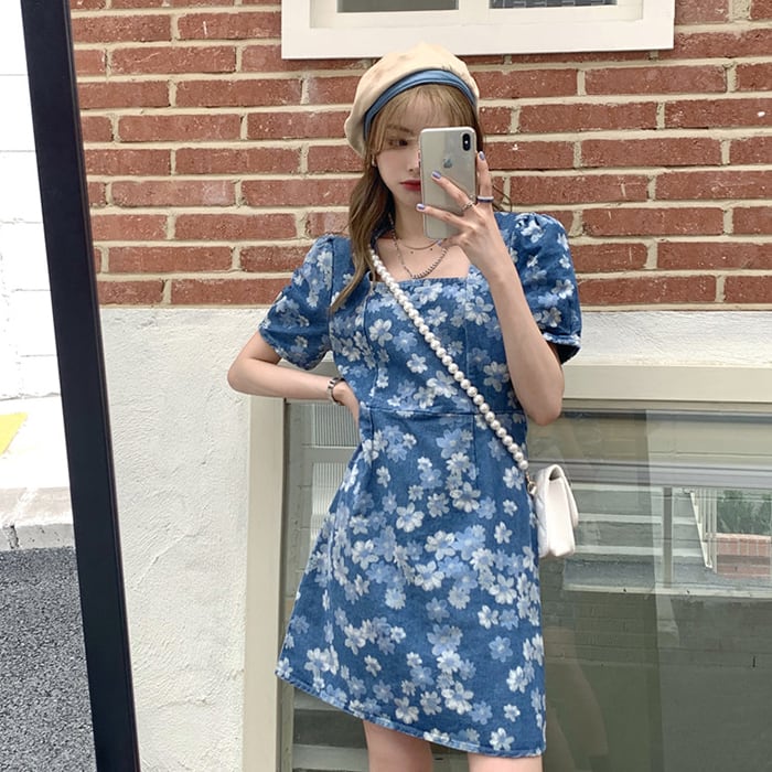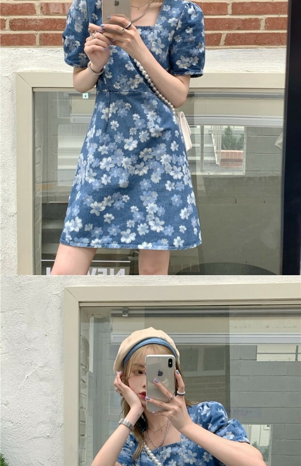 スタンダードカラーブルーフローラルスカート サマーウェストドレス カジュアルAライン レトロ 夏物 花柄 スクウェア kumikum23058248792