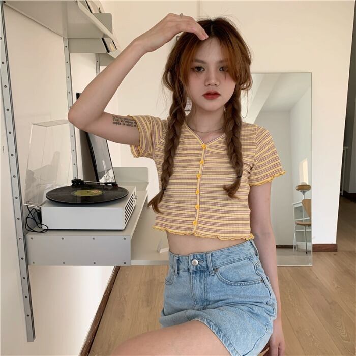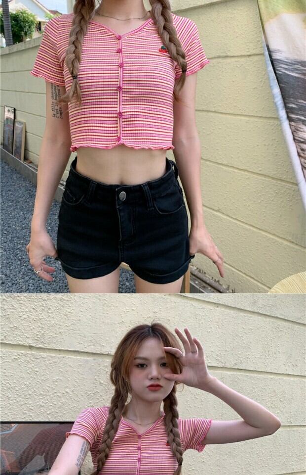 ストライプショートシャツ サマースリムカーディガンTシャツ レッド 刺繍 夏物 kumikum21201357120