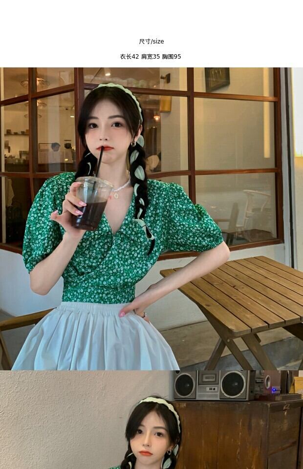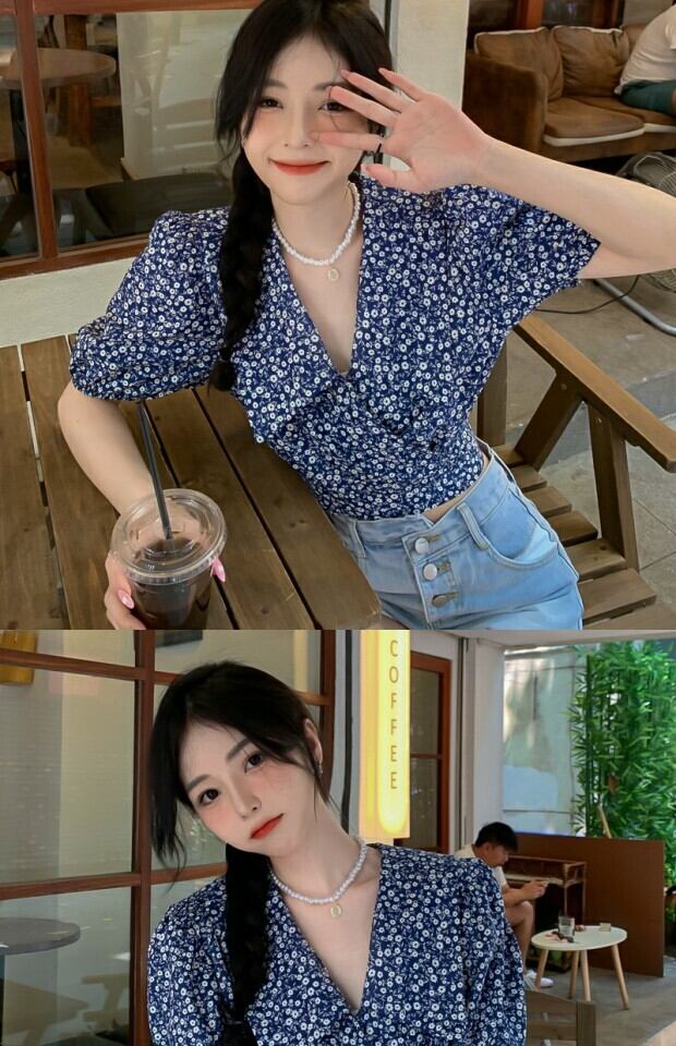スリーブフローラルシャツ サマースタンダードウェストショートシフォン レトロ 夏物 花柄 kumikum89261842786