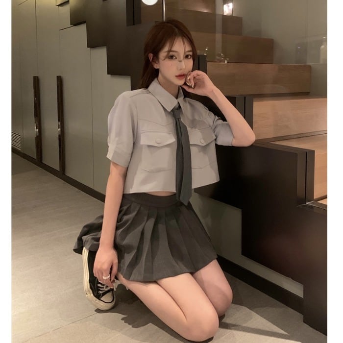 スタイルサマー薄手ショートシャツ ハイウェストウェストAラインプリーツスカート 夏物 kumikum3348537085