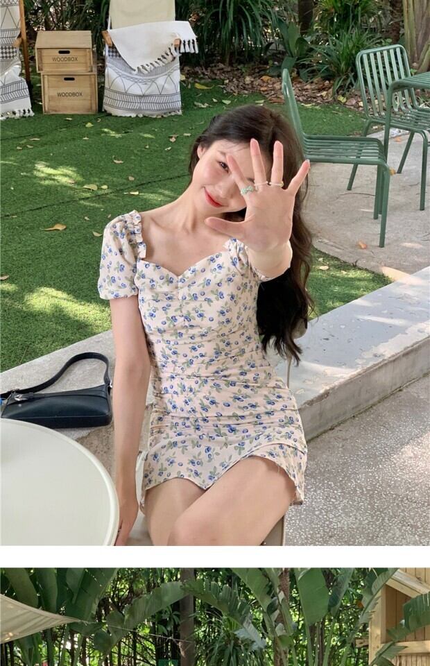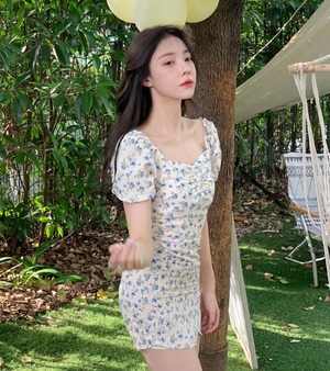 フローラルスカート サマースタイルスリーブウェストドレス Aライン 夏物 花柄 スクウェア kumikum80846630234