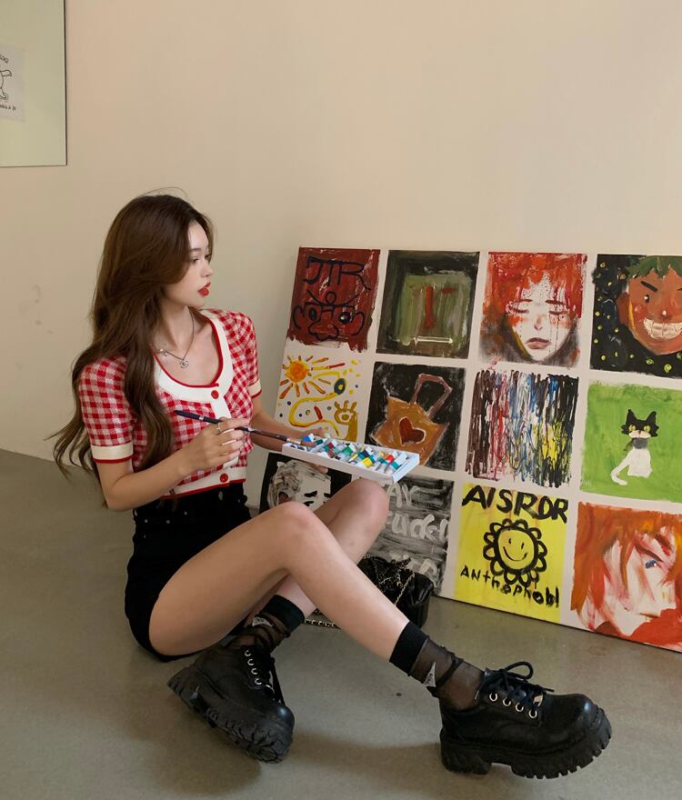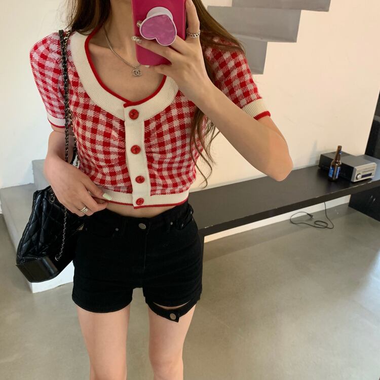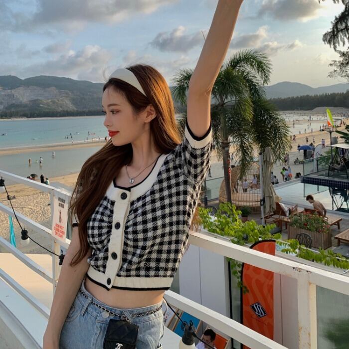 サマースリム薄手Vネック格子柄ニットカーディガンスタンダードショートスタイルトップス レトロ 夏物 kumikum59426208932