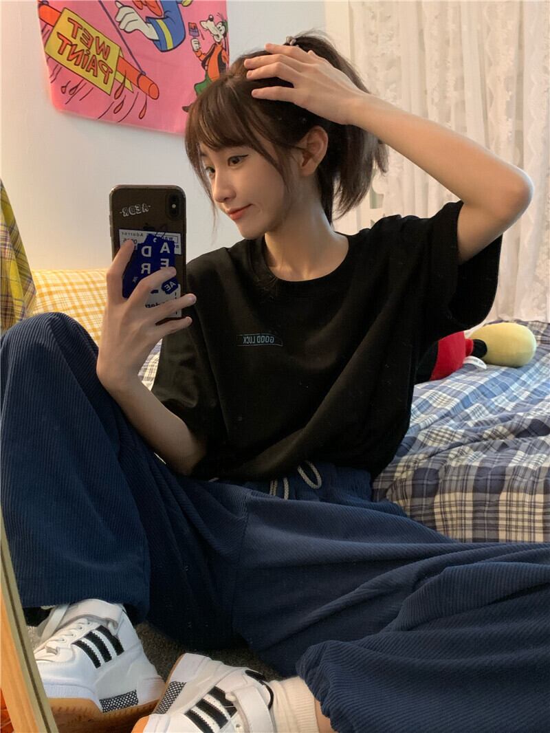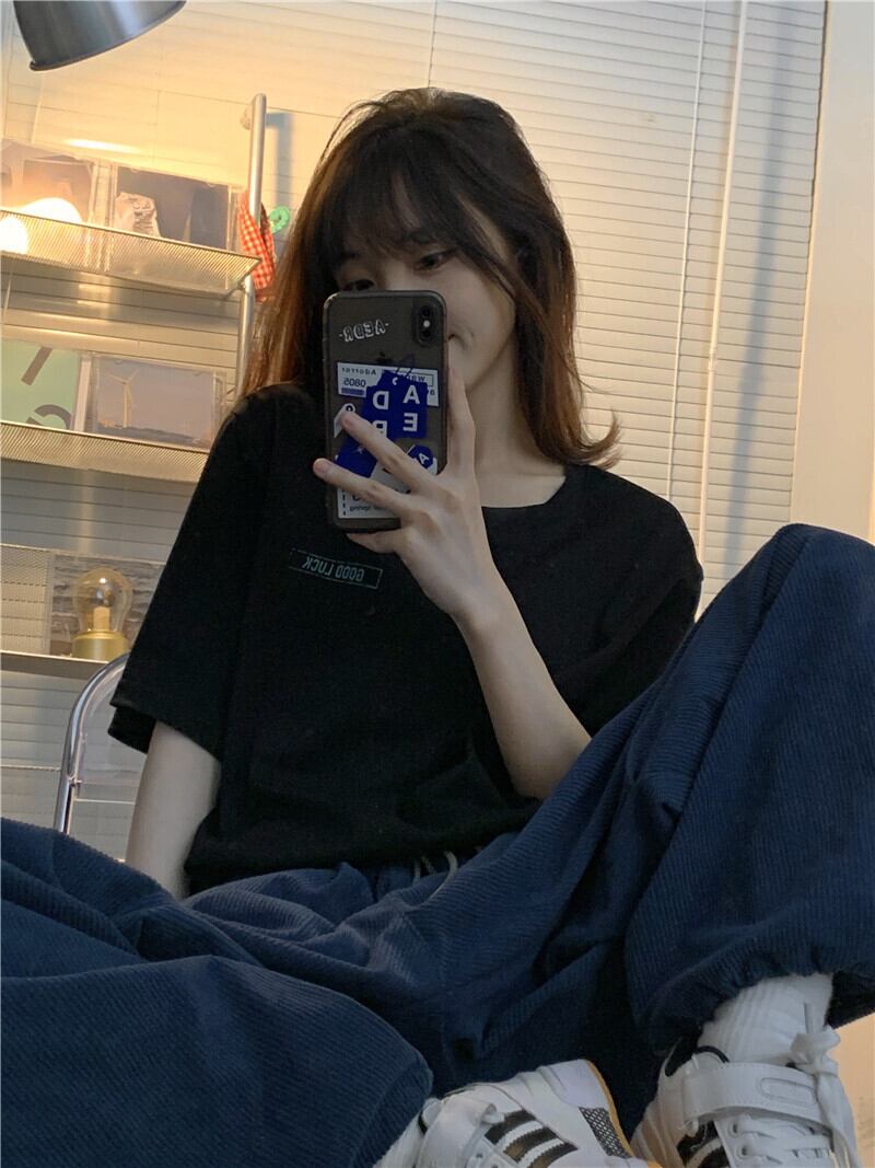 プリントラウンドネックTシャツ シャツ サマールーズスタイル 夏物 Oネック kumikum19283691907