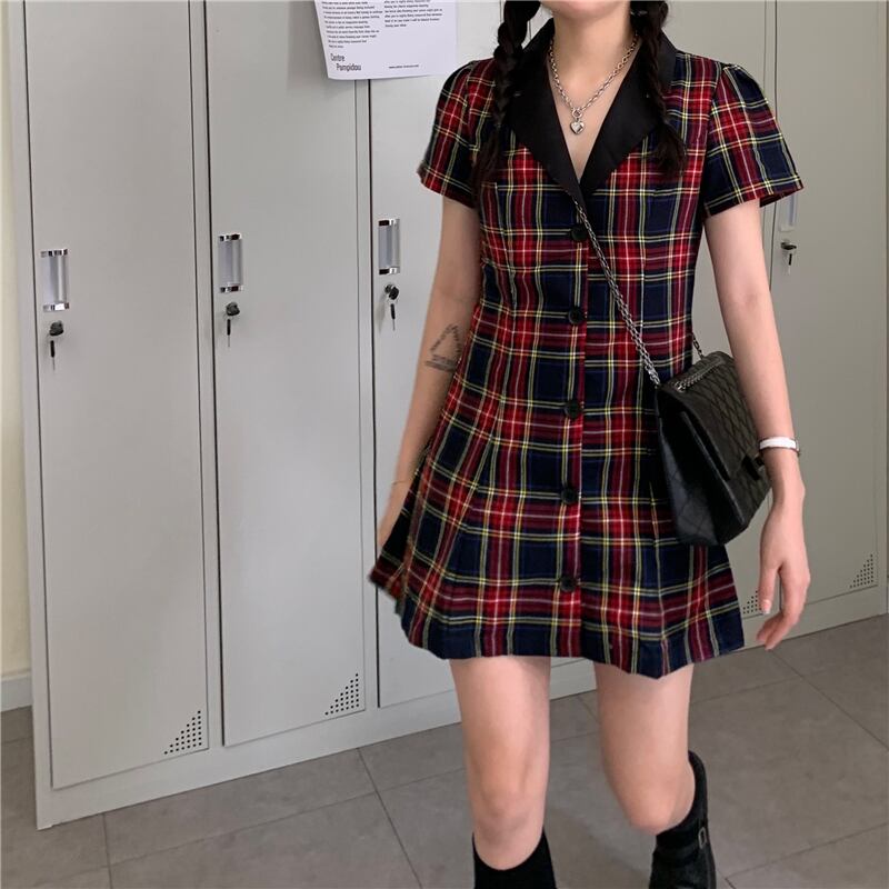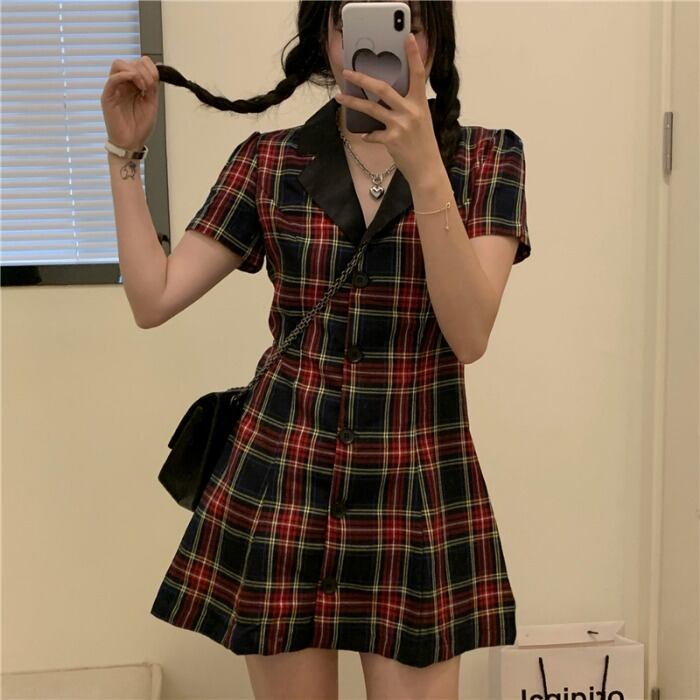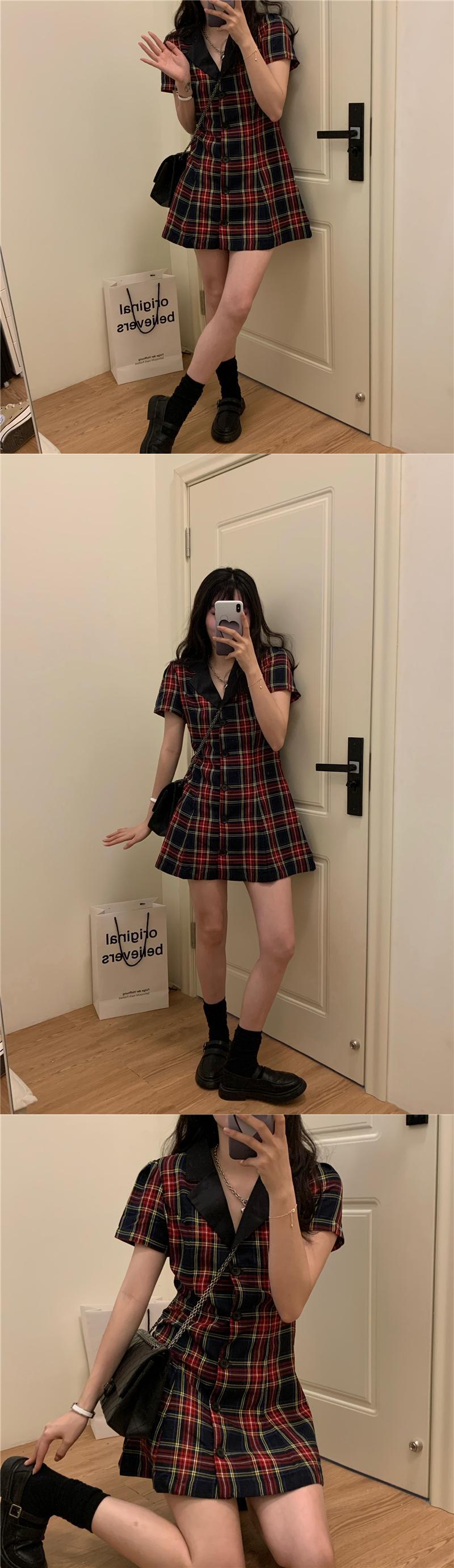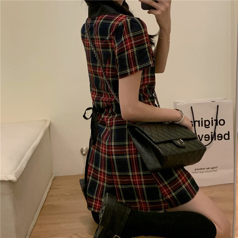 スタンダード格子柄Vネックドレス サマーウェスト薄手Aラインスカート スタイルシャツ レトロ 夏物 kumikum41267485244