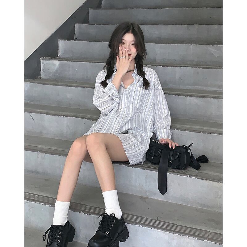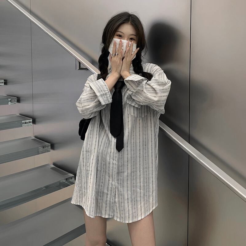 ルーズストライプシャツ レディースサマースタンダード ロング レトロ 夏物 kumikum10923586994
