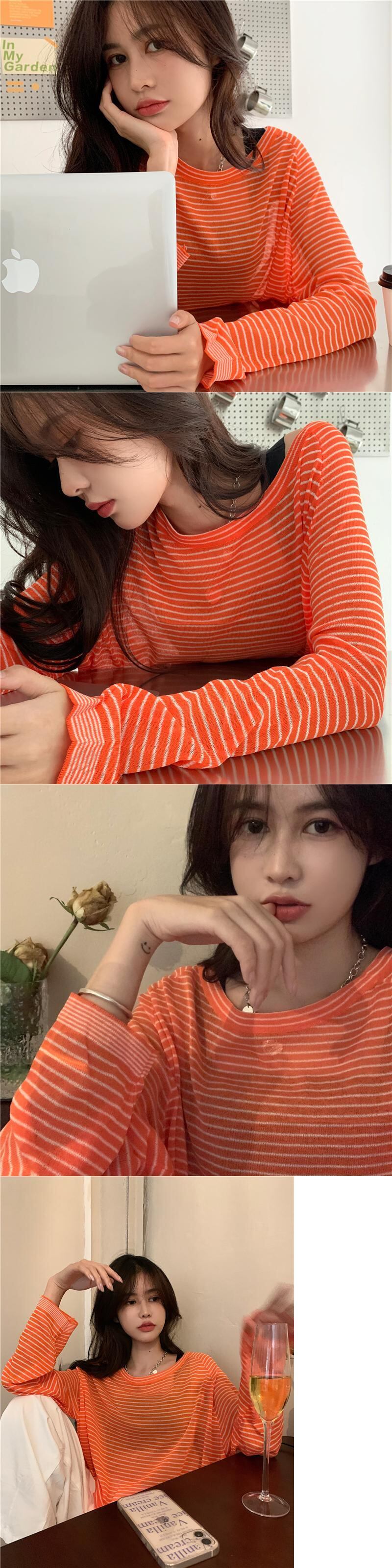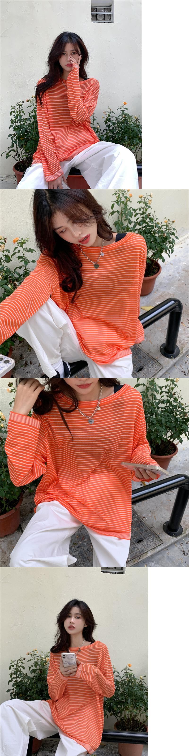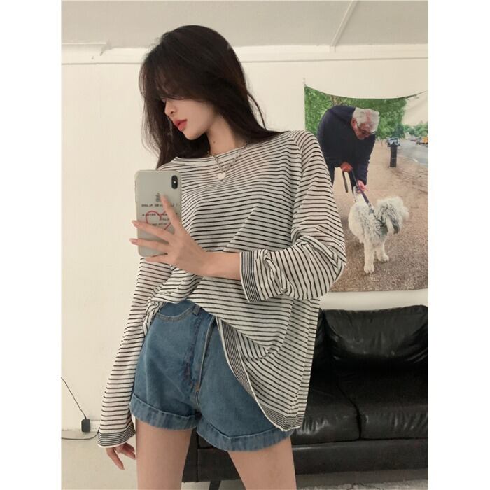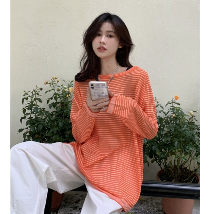 ベーシックルーズストライプニットTシャツ レディースサマー薄手ブラウス トップス ロング 夏物 kumikum2676786582