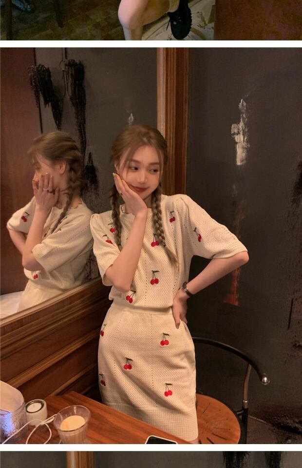 ショートニットトップス サマーハイウェストウェストスカート レッド 刺繍 夏物 kumikum25113789262