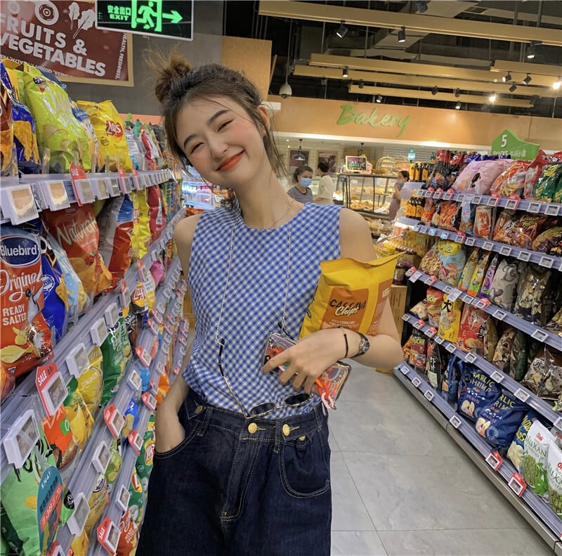 ブルースタンダード格子柄ラウンドネックルーズノースリーブサマースリム薄手トップス シャツ レトロ 夏物 Oネック kumikum84943850374