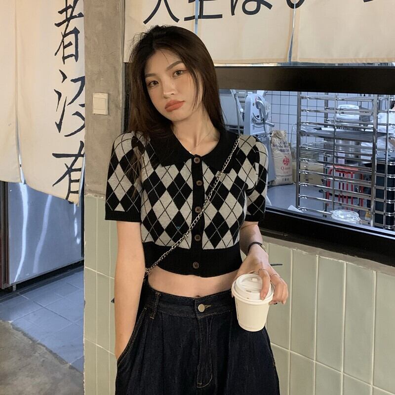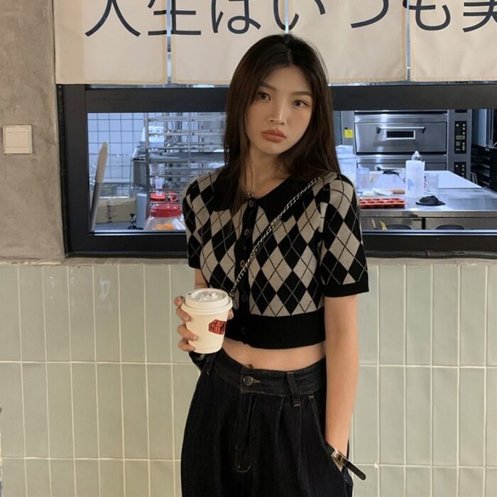 スタンダード格子柄スリムショートセーター トップス サマーレディース レトロ 夏物 kumikum57396705645