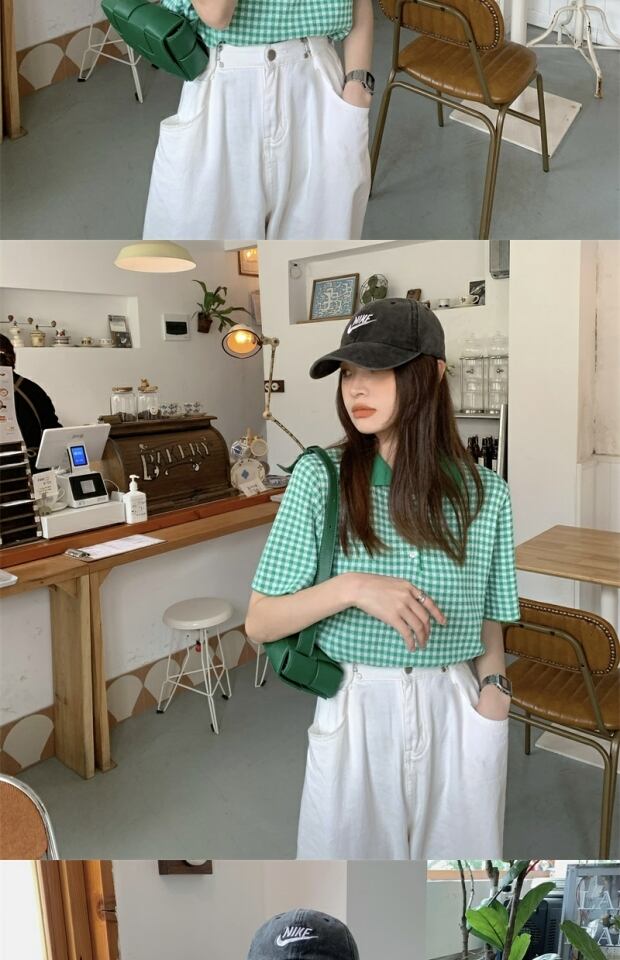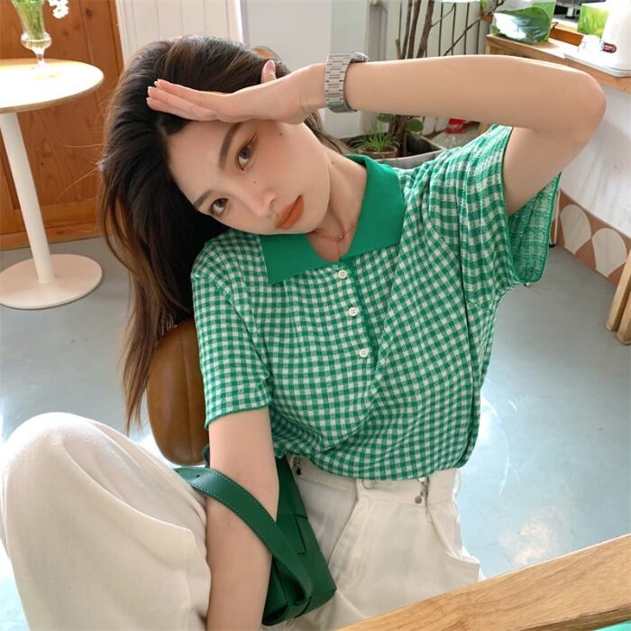 スタンダードカラーTシャツ サマー格子柄セーター ルーズ薄手トップス レディース レトロ 夏物 kumikum29011000956