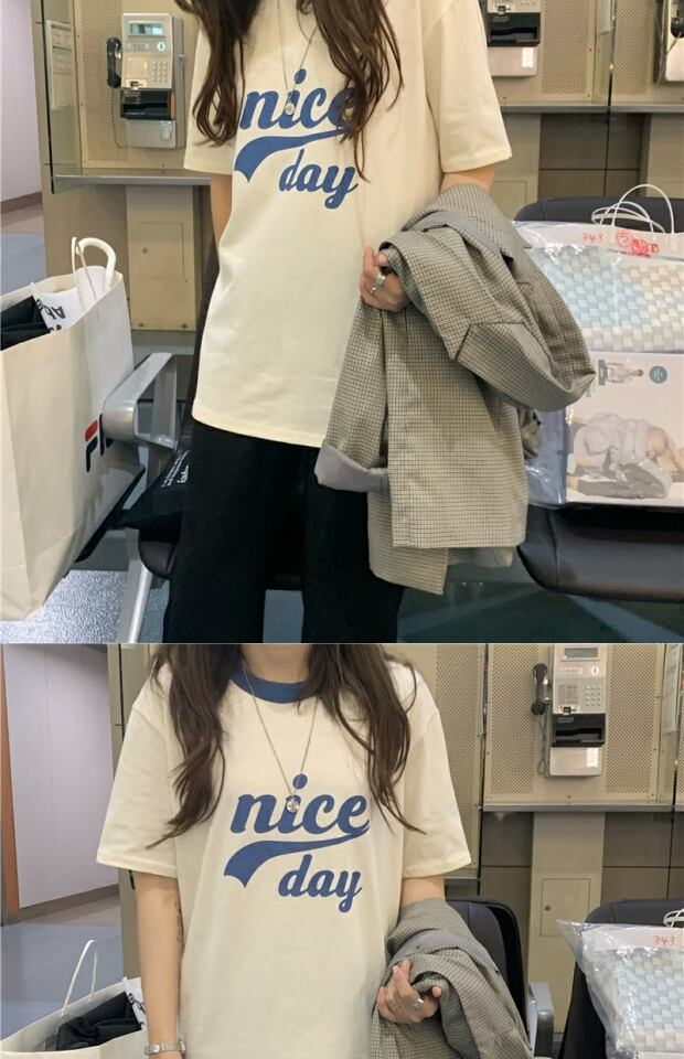 カジュアルカラーラウンドネックシャツ サマーブループリントルーズTシャツ レディース 夏物 Oネック kumikum79426554091
