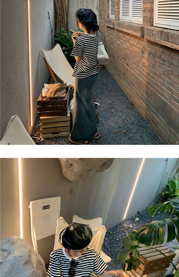 カラーラウンドネックストライプカジュアルルーズ薄手ニットTシャツ サマートップス 夏物 Oネック kumikum62756395019