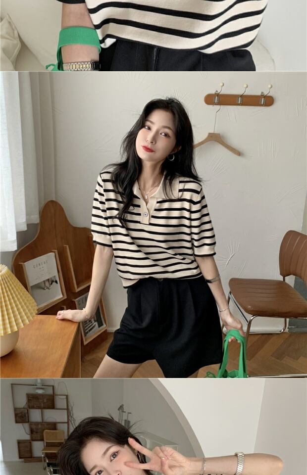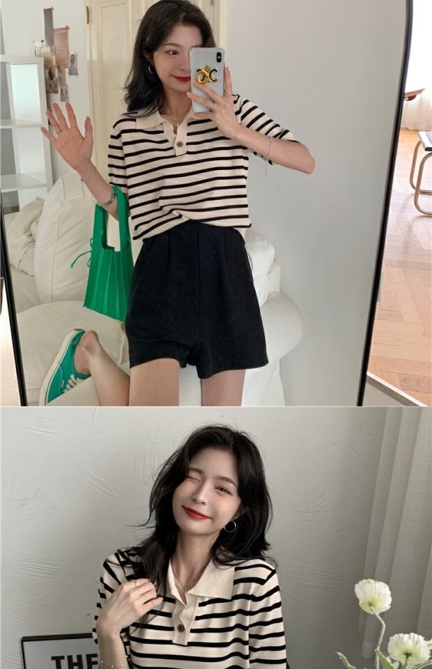 ルーズ薄手ニットストライプシャツ サマーカジュアルTシャツ 夏物 kumikum67083793902