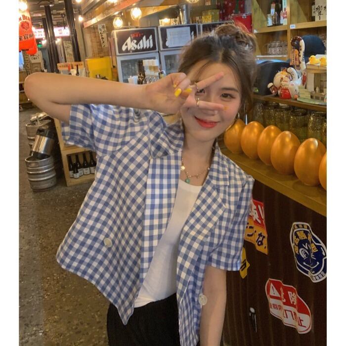 サマー格子柄ショートシャツ トップス カジュアルルーズジャケット 夏物 kumikum65119075298