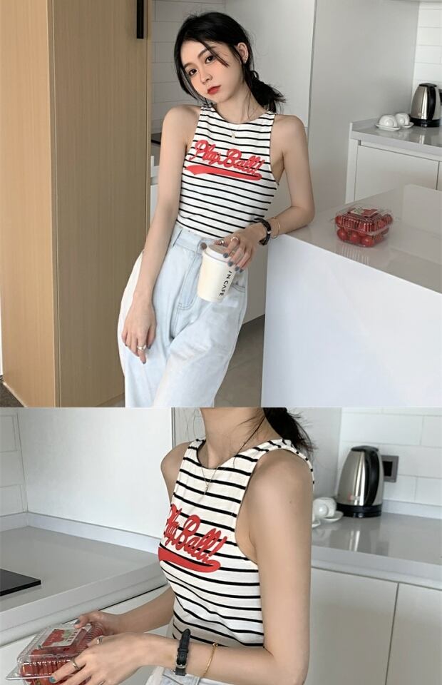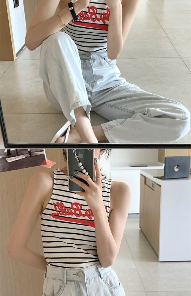 レッドショートストライププリントノースリーブサマー薄手Tシャツ トップス 夏物 kumikum83455191135